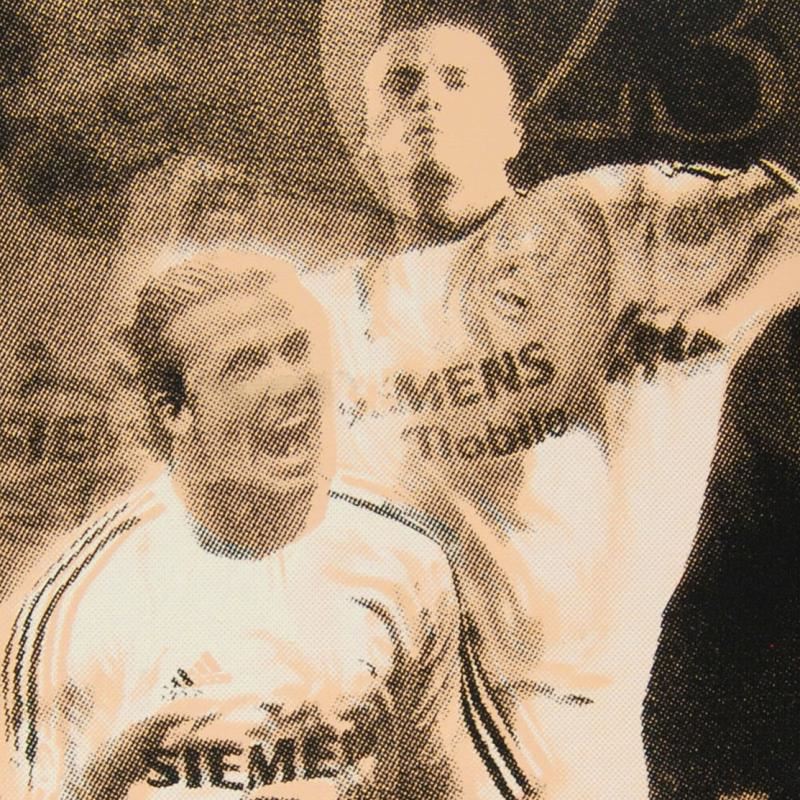"David Beckham" is a one-of-a-kind hand-pulled silkscreen and mixed media painting on canvas by Ringo. This piece is hand signed by the artist and comes from the Andy Warhol Legacy Series. Includes Certificate of Authenticity. Due to the nature of the canvas, these pieces will need to be mounted for framing. Measures approx. 12" x 16" (image).