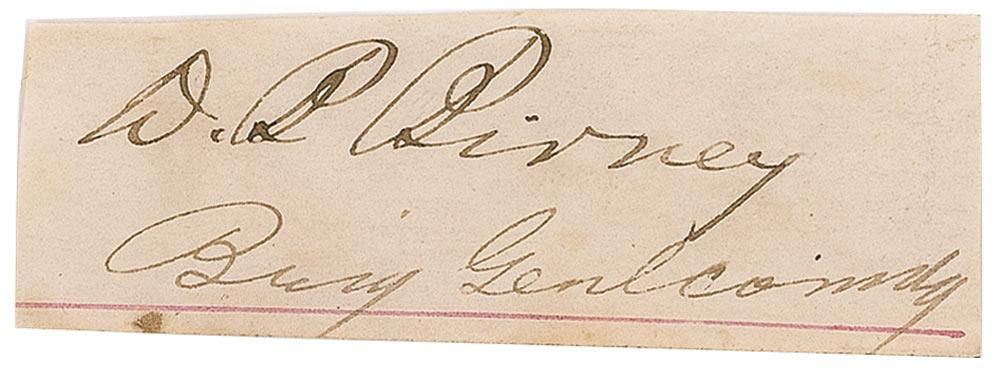 Union general (1825-1864) who served at Gettysburg, Second Bull Run, and Spotsylvania Court House. During the Siege of Petersburg, Birney fell ill with malaria and died three months later. Ink signature, “D. B. Birney,” on an off-white 2.25 x .75 clipped slip, with “Brig Genl Comdg,” underneath signature written in another hand. In fine condition, with some scattered mild toning.