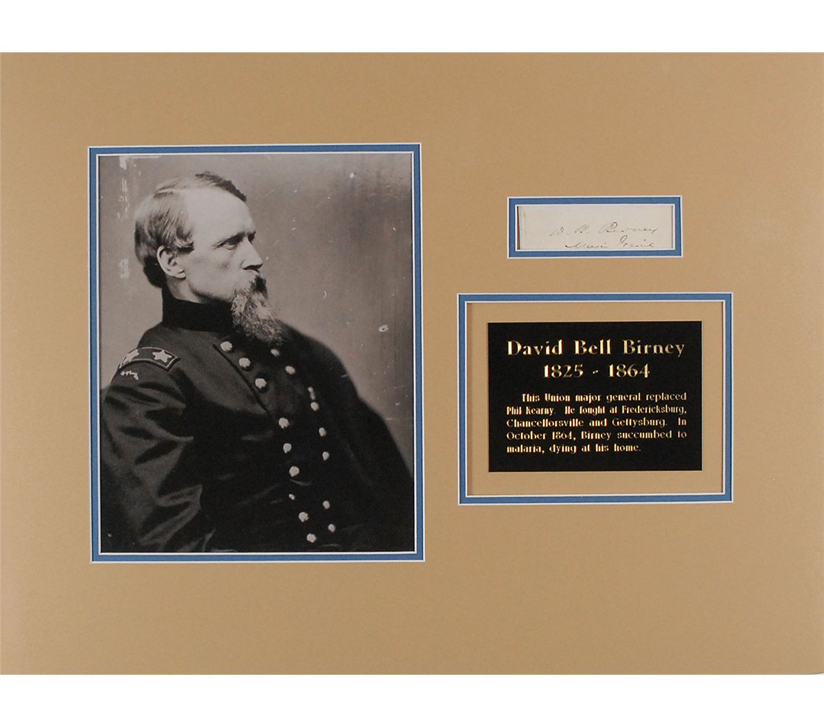 Union general (1825-1864) who served at Gettysburg, Second Bull Run, and Spotsylvania Court House. During the Siege of Petersburg, Birney fell ill with malaria and died three months later. Ink signature, “D. B. Birney, Major Gen’l,” on an off-white slip. Slip is affixed to a slightly larger card. Double-matted with a portrait of Birney and a biographical plaque to an overall size of 19.5 x 15. In fine condition, with a central horizontal fold and a vertical crease between the two initials of signature.