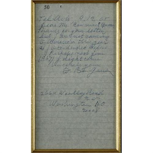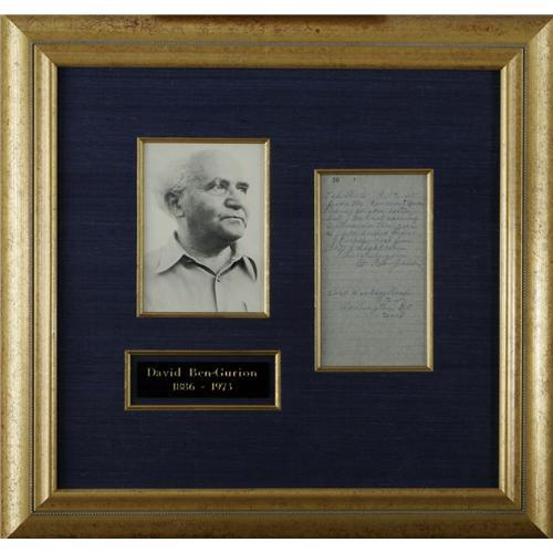 <B> David Ben-Gurion Autograph Letter Signed ,</B></I> "<I>D. Ben-Gurion".</B></I> One page, 4.50" x 8.0", Tel Aviv, December 12, 1965 to Lawrence E. Spurar, Washington, D.C. The letter reads, "<I>Thanks for your letter, but I am not coming to America this year as I intendended [sic] before. Perhaps next year (1967) I might come.</B></I>" Polish-born Zionist David Ben-Gurion arrived in Palestine in 1906 and was an instrumental figure in the creation of modern Israel. In 1948 he became the nation's first Prime Minister. This note, written on lined grey note paper, is imprinted with the number "50". Extra Fine. Mounted and framed with a custom nameplate and photograph. <BR><BR><B>Important