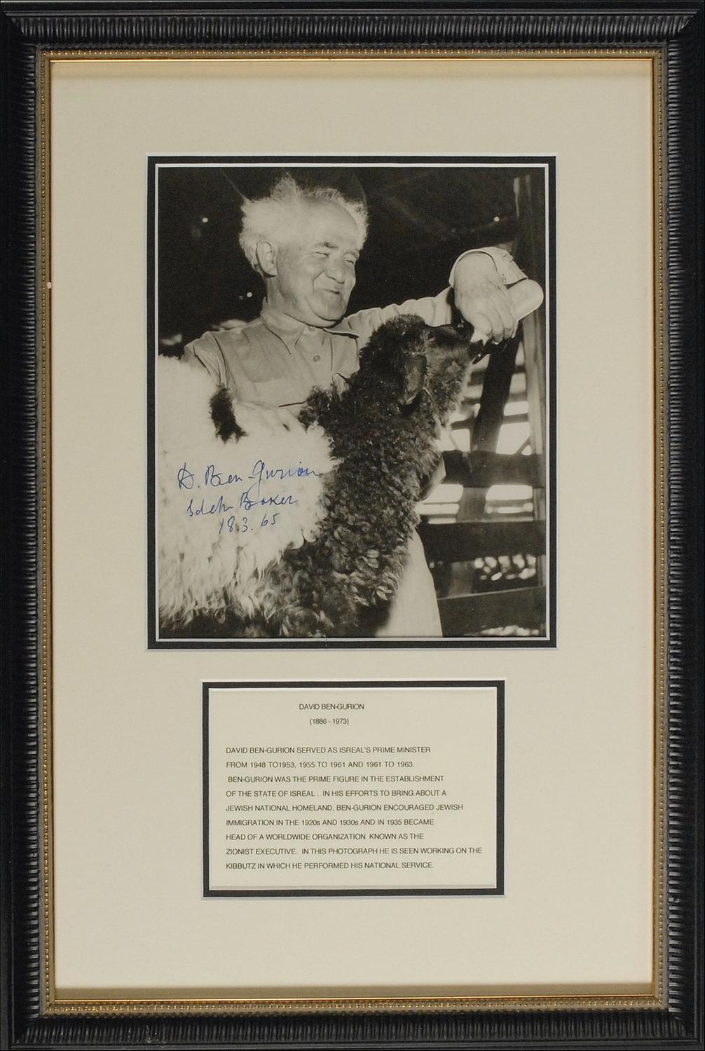 Prominent Zionist leader (1886–1973) who served as first Prime Minister of Israel. Matte-finish 7.25 x 9 photo of Ben-Gurion bottle feeding a sheep being raised in his kibbutz in the Negev, signed in blue ink, “D. Ben-Gurion, Sdeh-Boker 18.3.65.” Double matted and framed with a printed caption, to an overall size of 13.5 x 20. In fine condition, with light ink spot to last name of signature and a couple very minor surface creases.