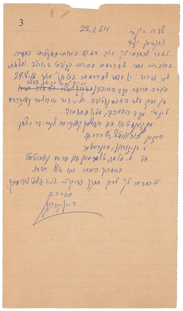 ALS in Hebrew, signed “D. Ben-Gurion,” one page, lightly-lined, 4.75 x 8.25, January 22, 1964. Letter to longtime friend and early Zionist leader, Baruch Zuckerman. In full (translated): “After writing to you on January 8, 1964 with my remarks, I stumbled by chance upon collections of my writings published while I was in ‘exile’ in the U.S.A. and I found two items: 1) a letter I published in the ‘Tag’ on August 29, 1916, a strong denunciation against the agreement with Hebrew date…2) a pamphlet in favor…of ‘Der Yiddishe’…against the agreement signed by Executive Board of the…Congress League: Dr. Yitzhak ‘Isaac’ Hurvitch, Chairman, D. Ben-Gurion, Secretary, Dr. S. Melamed, Chairman of the Press Committee. Dated according to the Hebrew calendar on the 21st day of Elul 5676 [September 19, 1916]. I did not write to you in order to change the date, but just to let you know.” In very good condition, with uniform toning, scattered creases and wrinkles, and a few edge tears and areas of paper loss. Accompanied by the original transmittal envelope addressed in Ben-Gurion’s hand.