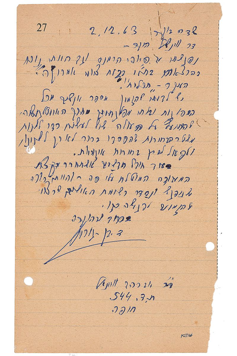 ALS in Hebrew, signed “D. Ben-Gurion,” one page, lightly-lined, 4.75 x 8.25, December 2, 1963. Letter to Dr. Avraham Vishnel. In part: “I have met with Professor Harmena. Also I have been present at your lectures in the House of American Zionists, in Tel Aviv… I want to invite a few people from all the parties and ones that are not in any group since we will need to consult them about an action. One that we need to bring up in order to appoint an election method that it's lacking is obvious to us both, and to act to change the election. I would like to meet with you in a month or two when I shall be a little more free from work I must do here. We should make a list of all the people that should attend this meeting.” In very good condition, with uniform toning, rusty paperclip mark and tear to top, punch holes to edges, and some slight paper loss to lower right.