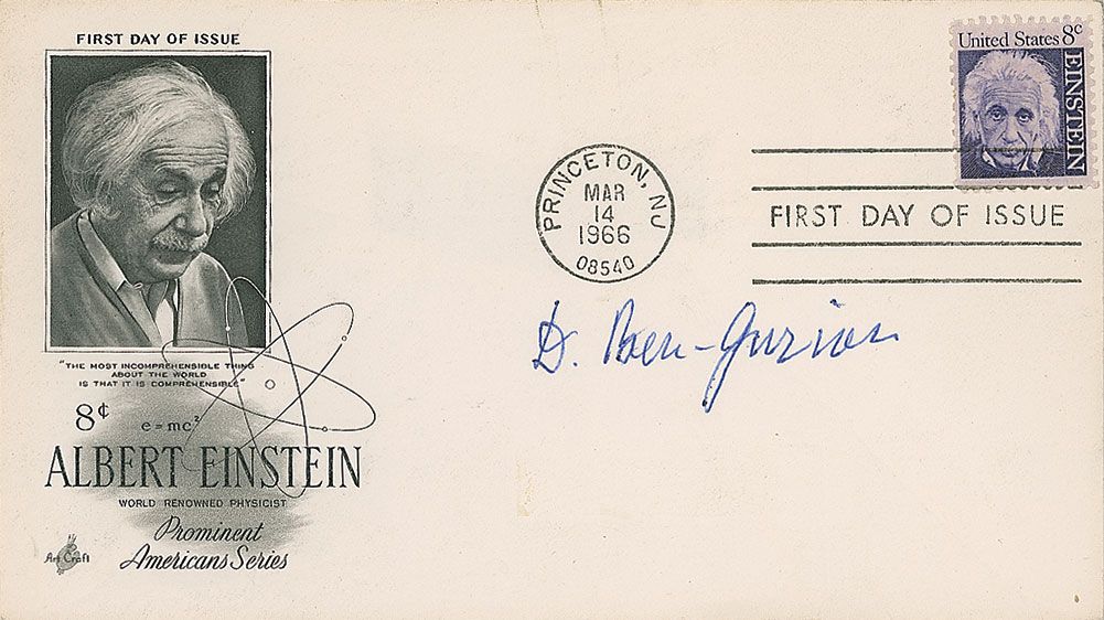 FDC with a cachet honoring Albert Einstein, signed in blue ballpoint, “D. Ben-Gurion.” In fine condition, with a light vertical crease through a single letter of signature.