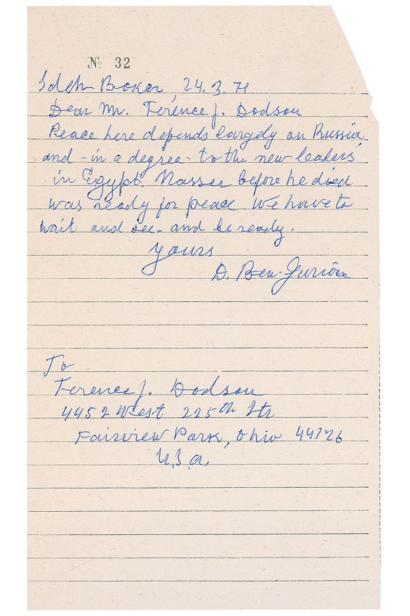 ALS signed “D. Ben-Gurion,” one page, lightly-lined, 5 x 8.5, March 24, 1971. In full: “Peace here depends largely on Russia and—in a degree—to the new leaders in Egypt. Nasser before he died was ready for peace. We have to wait and see and be ready.” In fine condition, with missing top right corner.