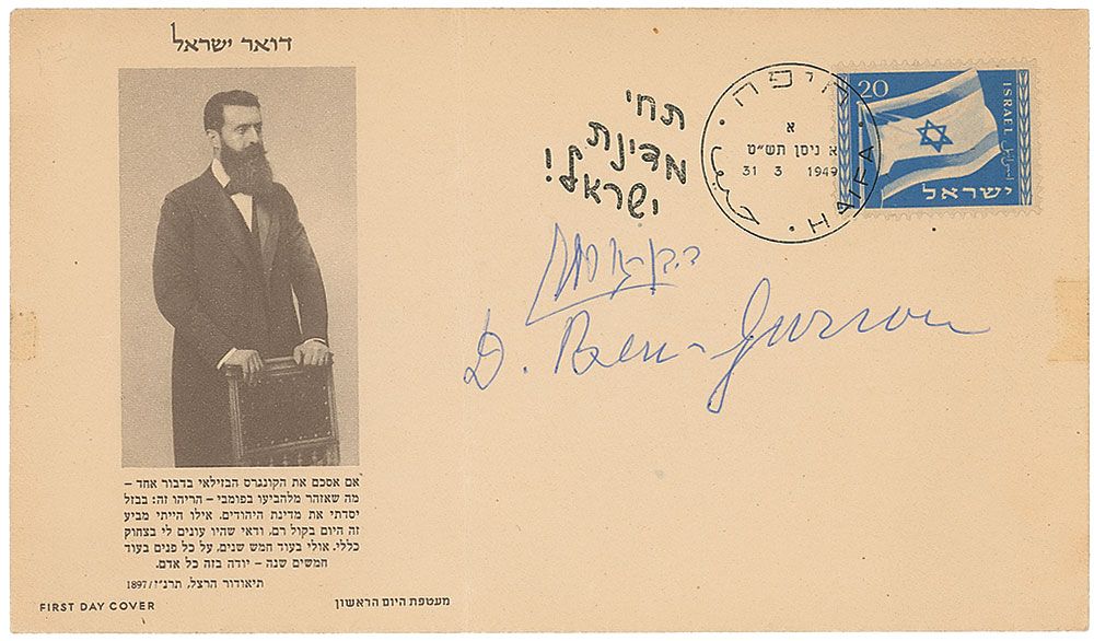 Commemorative cover with a cachet honoring Theodor Hertzl, signed in blue ballpoint by Ben-Gurion. A uniform shade of mild toning and a vertical fold to the left of signature, otherwise fine condition. Accompanied by the original mailing envelope and a pre-printed compliments card.