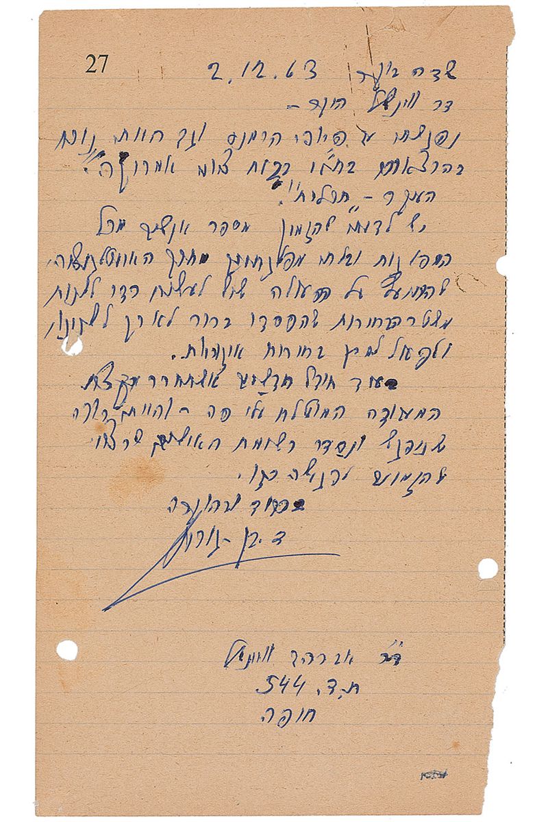 ALS in Hebrew, one page, lightly-lined, 4.75 x 8.25, December 2, 1963. Letter to to Dr. Abraham Vishnel in Haifa. In part (translated): “I have met with professor Harmena. Also I have been present at your lectures in the House of American Zionists, in Tel Aviv…I want to invite a few people from all the parties and ones that are not in any group since we will need to consult them about an action. One that we need to bring up in order to appoint an election method that it's lacking is obvious to us both, and to act to change the election. I would like to meet with you in a month or two when I shall be a little more free from work I must do here. We should make a list of all the people that should attend this meeting.” In very good to fine condition, with punch holes to left and right edges, a couple small tears and rusty paperclip marks to the top, and a few light stains.