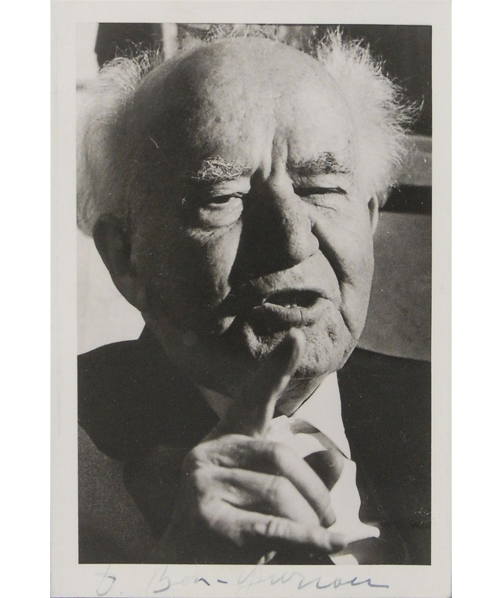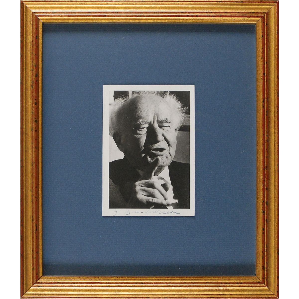 Uncommon matte-finish 3.5 x 5 photo of Ben-Gurion with his finger pointed skyward, signed in the lower border in fountain pen, “D. Ben-Gurion.” Mounted against a blue background and framed to an overall size of 9.75 x 11.25. In fine condition, with portions of the signature a bit faded.