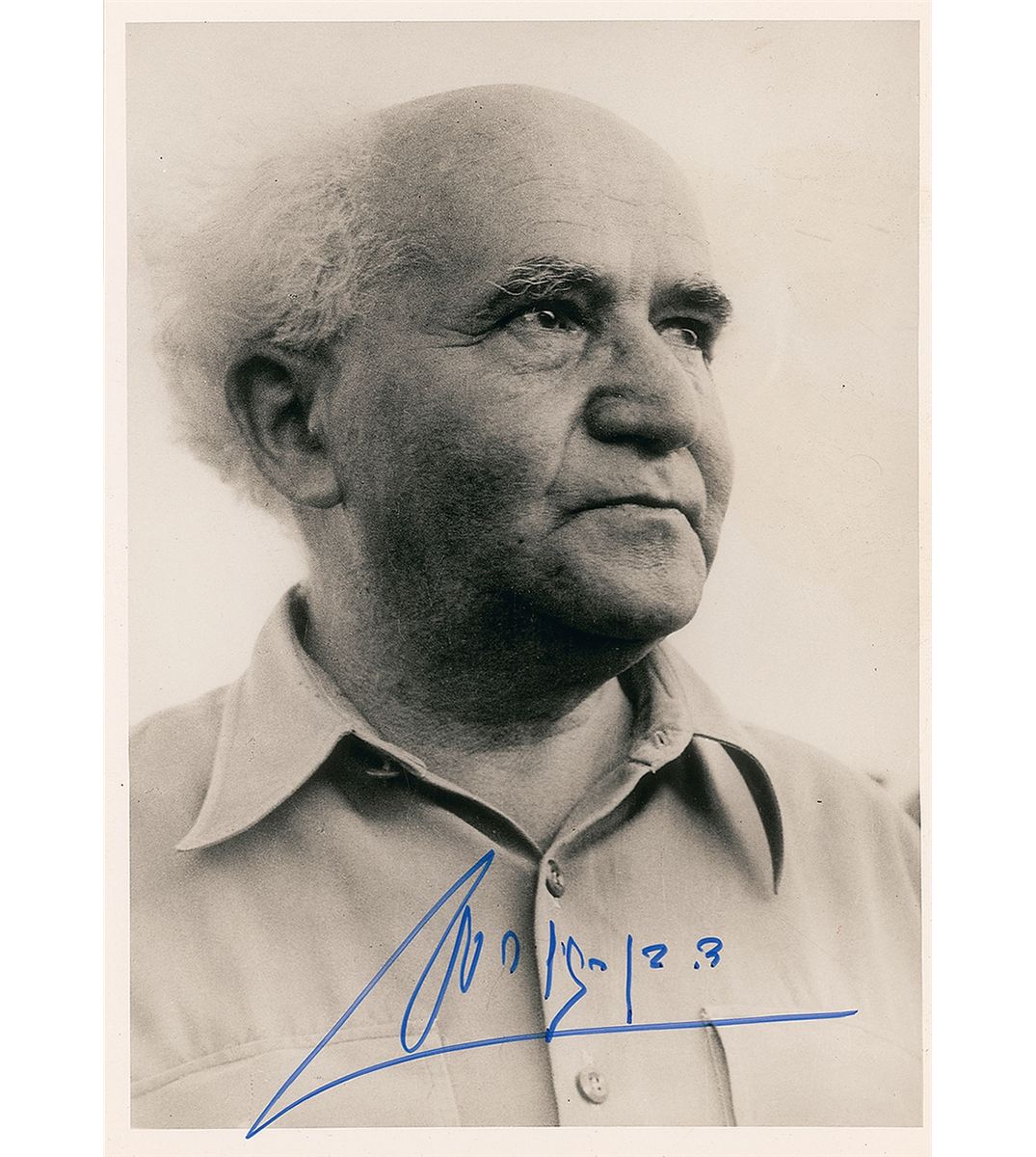 Glossy 5 x 7.25 photo of Ben-Gurion casting a pensive gaze, signed in blue felt tip. In fine condition.