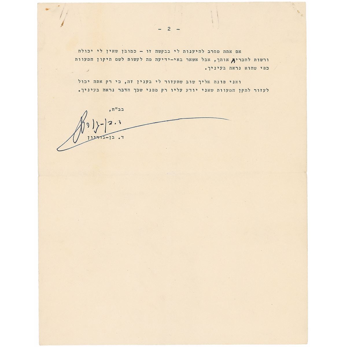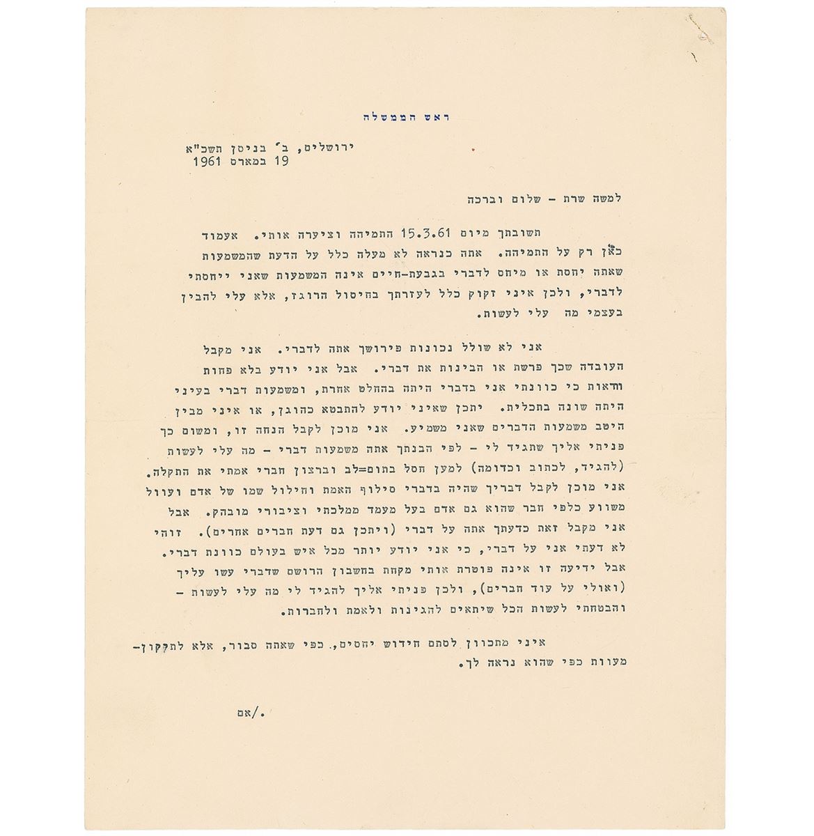 TLS in Hebrew, signed “D. Ben-Gurion,” two pages, 8.5 x 11, personal letterhead, March 19, 1961. Letter to Foreign Minister Moshe Sharett, in part (translated): “You have, evidently, not considered the possibility that the significance which you attributed or are attributing to the remarks I made in Giv’at Hayyim is not the same as the significance that I intended in my statements…It is possible that I do not know how to express myself correctly, or I do not understand well the intention or the significance of the statements that I express…I am prepared to accept your assertion that in my remarks there was a distortion of truth and the denigration of the name of a man and an unjustified accusation against a comrade who is also a person of official position and one of public prominence…I have, therefore, turned to you to advise me as to what course of action I should take. And I have vowed to do all that I can in the spirit of fairness, of truth, and of friendship.” Staple holes and rusty paperclip impressions to top edge, central vertical and horizontal folds, and light scattered creasing, otherwise fine condition. Accompanied by an unsigned photo of Ben–Gurion.