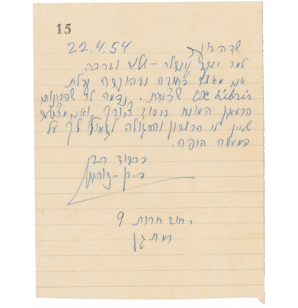 Untranslated ALS in Hebrew, one page, 4.5 x 6, April 22, 1954. In fine condition. Accompanied by the original mailing envelope addressed in Ben-Gurion’s hand.