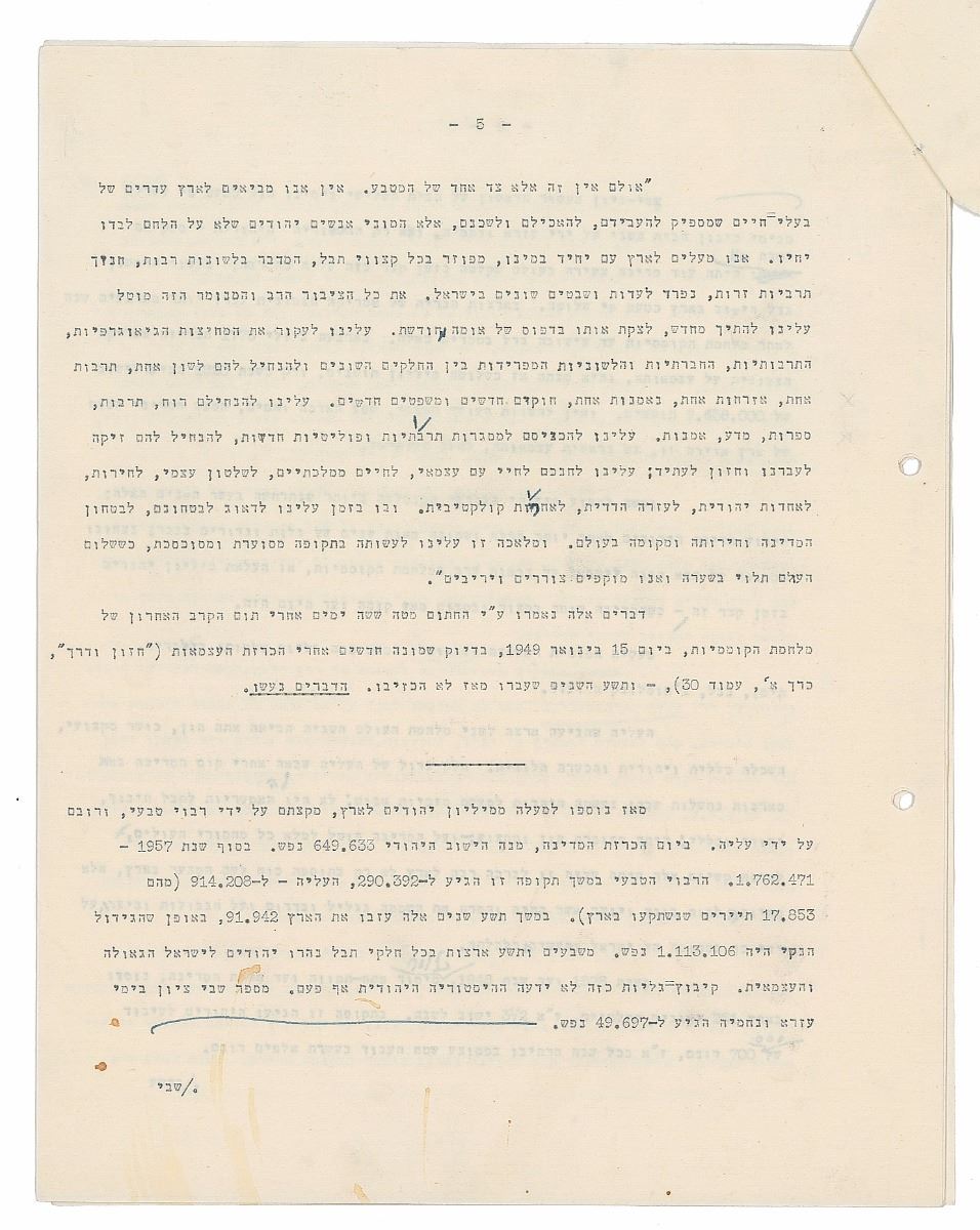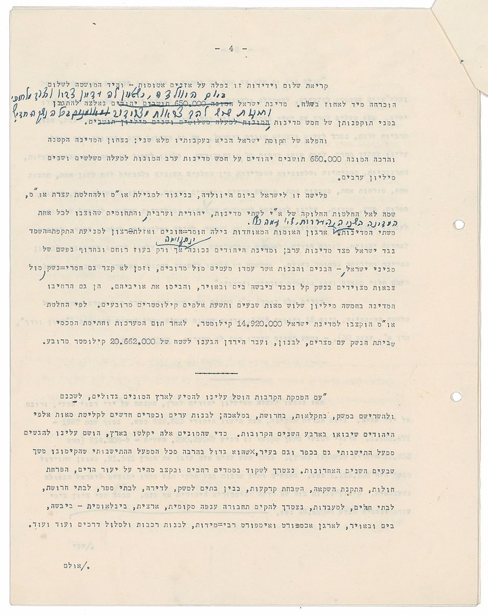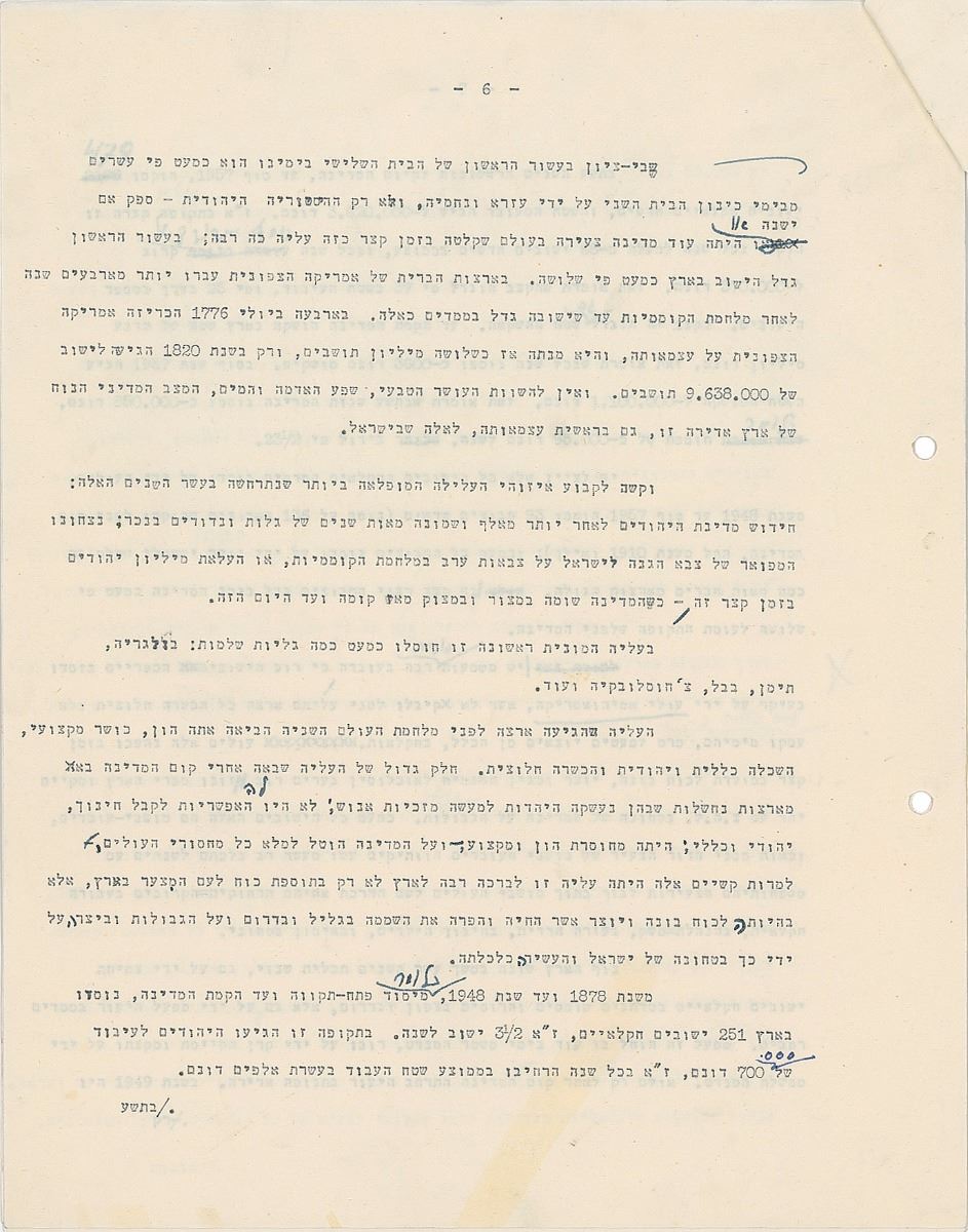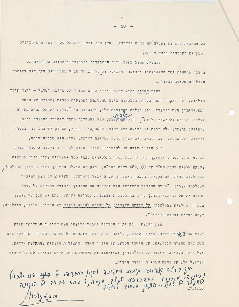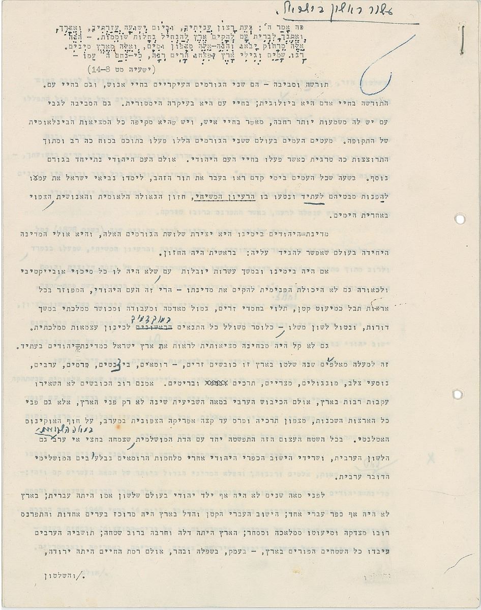 TMS in Hebrew, ten pages, 8.5 x 11, January 27, 1958. An exhaustive historical and philosophical treatise tracing the identity and Sitz-im-Leben [“ life setting,” “situation in life,” “sociological setting”] of the Jewish people in exile with many references to Biblical and Rabbinical texts upon which to base a vision for the newly founded modern state of Israel. The piece is intellectual but also emotional and has references to the Law of Return, as it will be the historical basis for this, as well as specific legislation such as the State Education Act. Signed at the conclusion by Ben-Gurion, who also adds several corrections and revisions throughout. In fine condition.