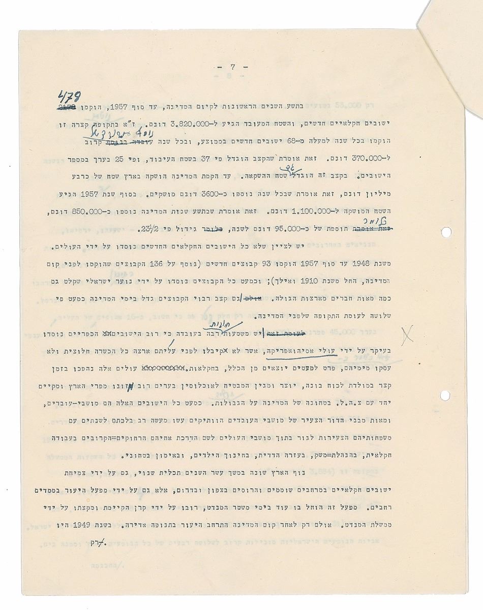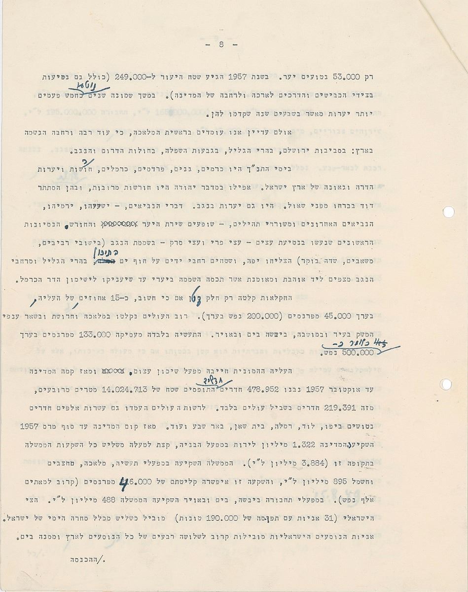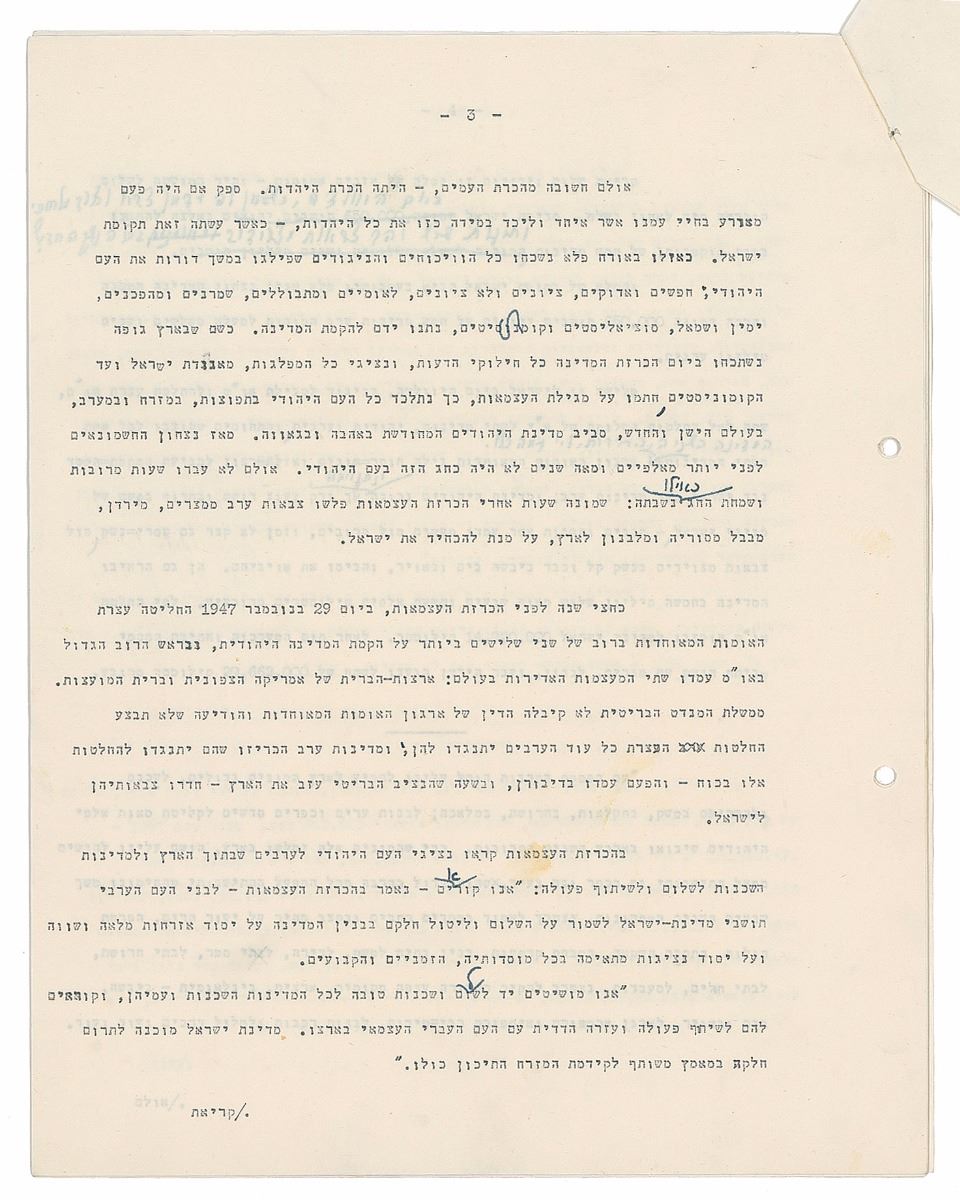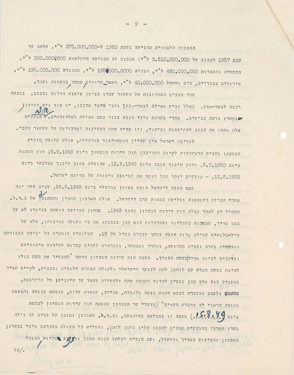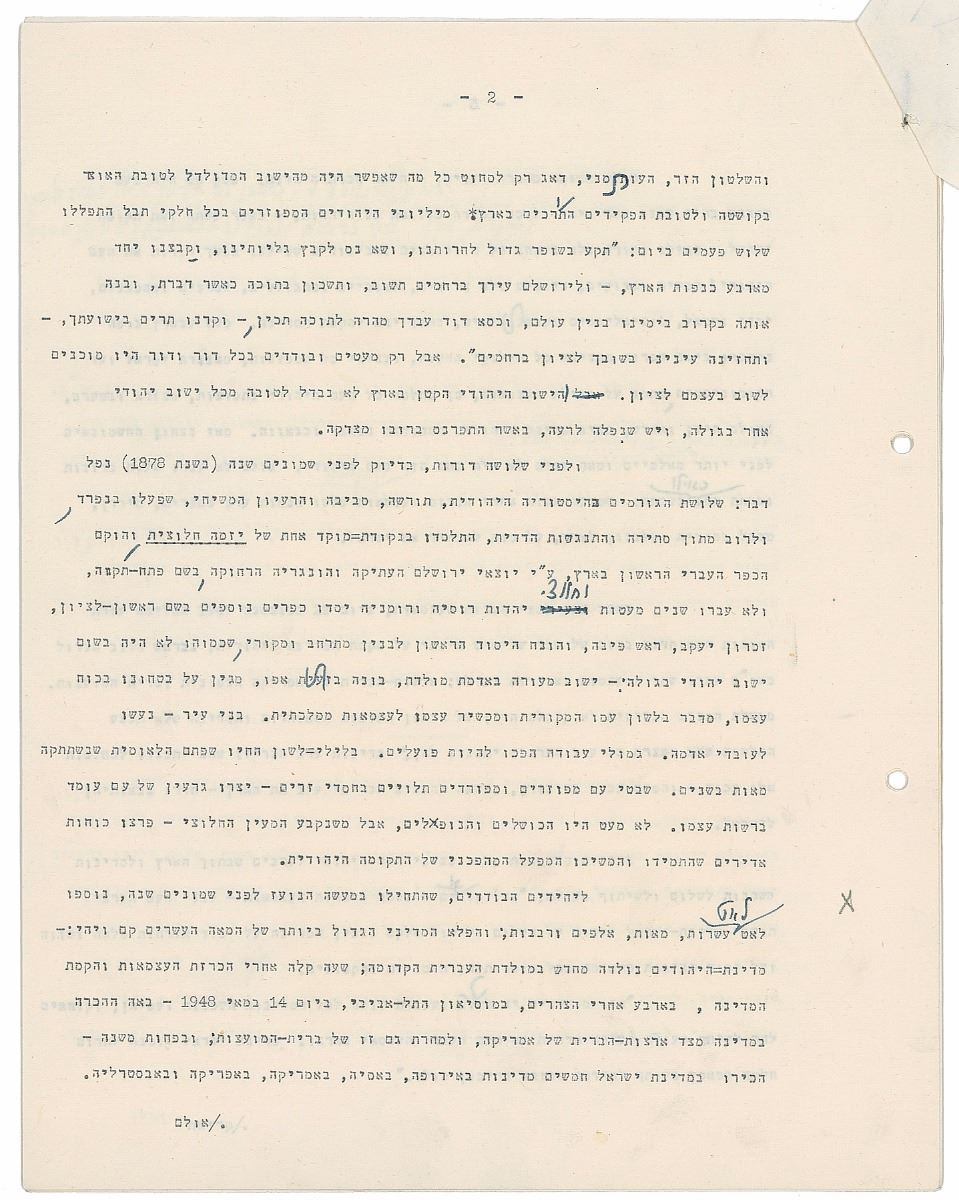 TMS in Hebrew, ten pages, 8.5 x 11, January 27, 1958. An exhaustive historical and philosophical treatise tracing the identity and Sitz-im-Leben [“ life setting,” “situation in life,” “sociological setting”] of the Jewish people in exile with many references to Biblical and Rabbinical texts upon which to base a vision for the newly founded modern state of Israel. The piece is intellectual but also emotional and has references to the Law of Return, as it will be the historical basis for this, as well as specific legislation such as the State Education Act. Signed at the conclusion by Ben-Gurion, who also adds several corrections and revisions throughout. In fine condition.