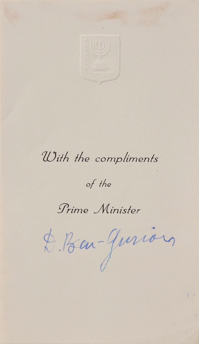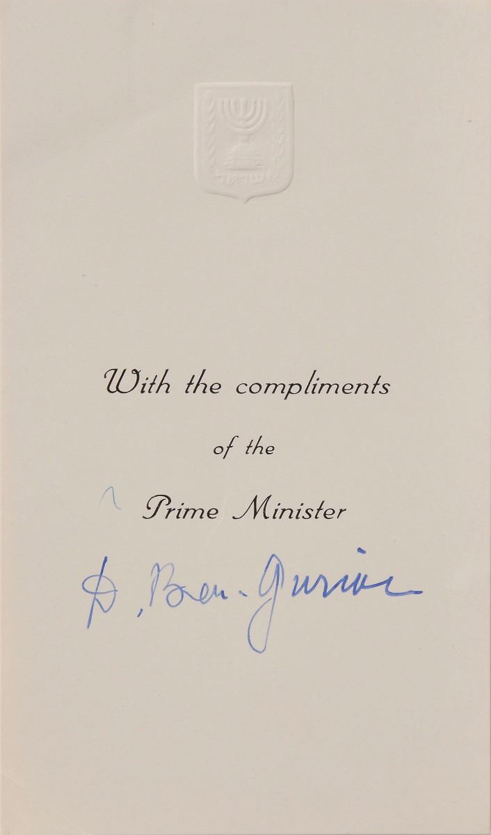 Two fountain pen signatures, “D. Ben-Gurion,” on individual off-white 3.5 x 6 slips from the Israeli prime minister’s office. In fine condition, with show-through from adhesive to the top of one slip.