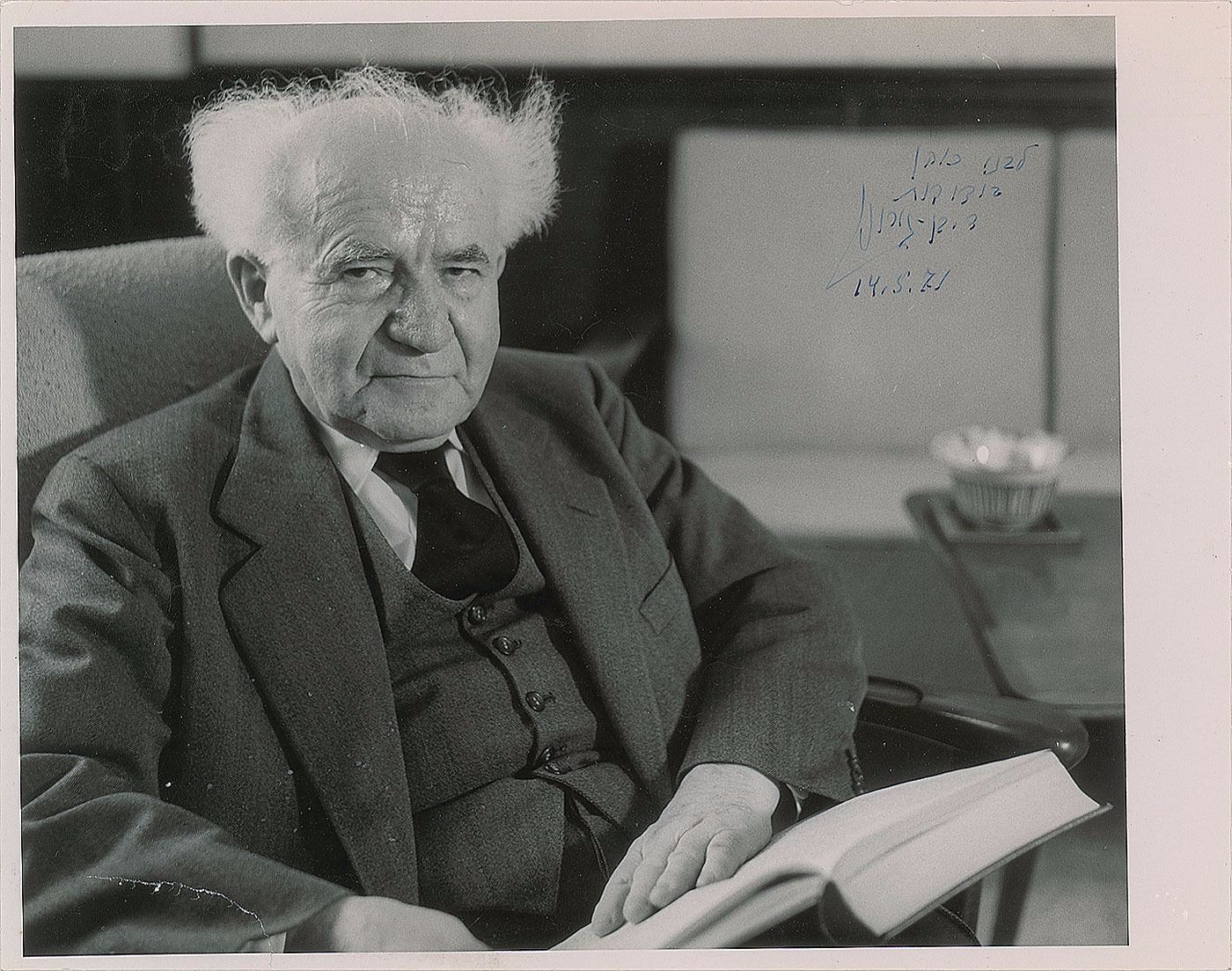 Glossy 9 x 7 photo of Ben–Gurion seated with a book on his lap, signed in black ink in Hebrew, adding the date, "14.5.71." Reverse bears a "State of Israel, Government Press Office" stamp. In fine condition, with a few light surface impressions, and a tear to the lower edge repaired with old tape on the reverse.