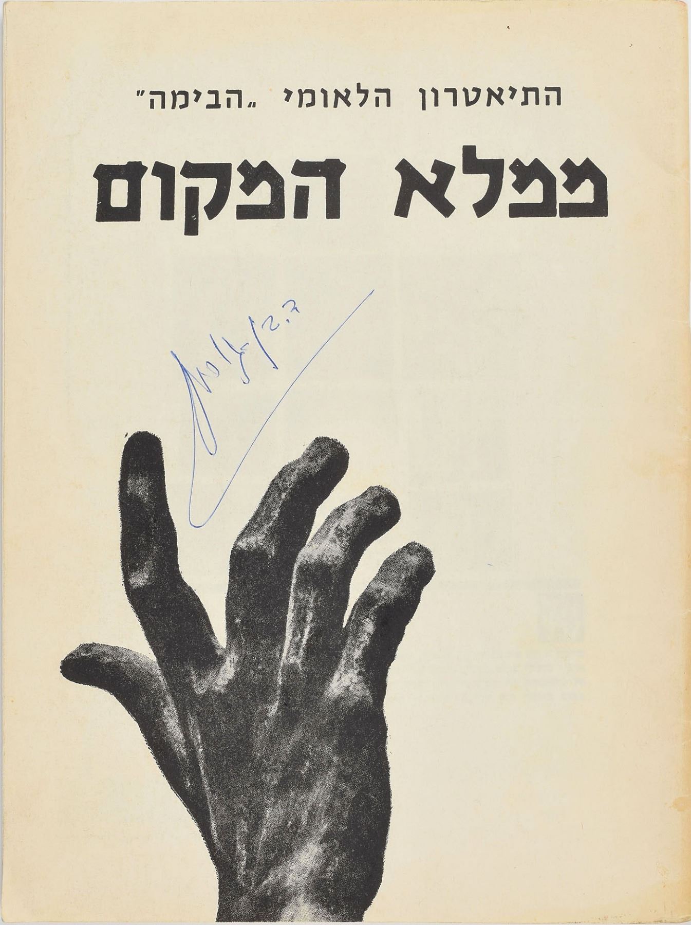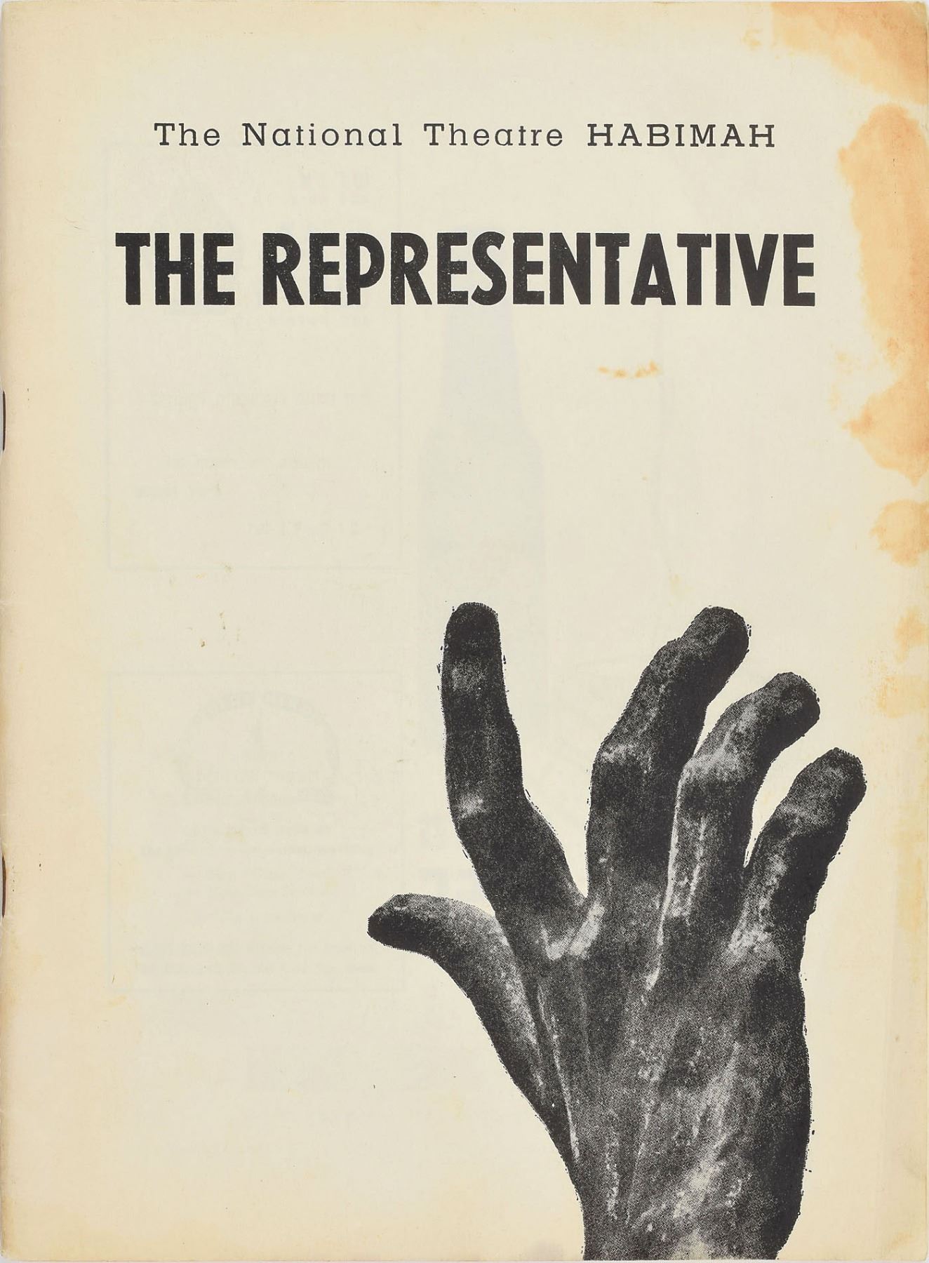 Program in Hebrew and English for Rolf Hochhuth's The Representative, presented at the National Theater Habimah in 1964, 8.5 x 10.5, prominently signed on the cover in blue ballpoint by David Ben-Gurion. In fine condition, with staining to the front cover.