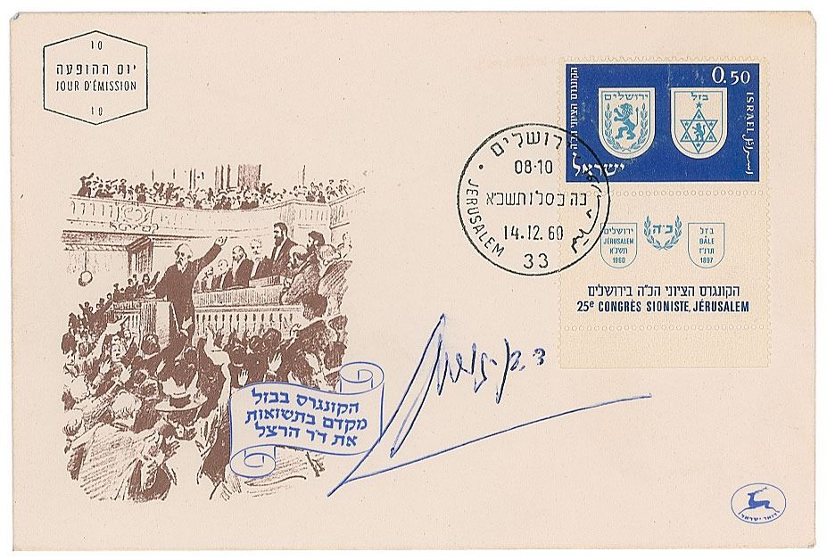Israeli commemorative cover from 1960, signed in blue ballpoint in Hebrew by David Ben-Gurion. In fine condition.