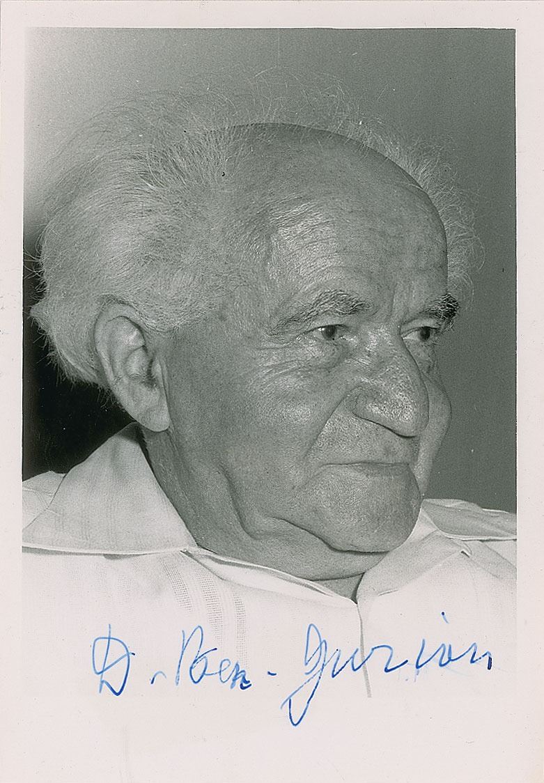 Vintage glossy 3.5 x 5 close-up photo of the Israeli prime minister, signed in fountain pen, "D. Ben-Gurion." In very good to fine condition, with a few small surface impressions touching his nose, and a light paperclip impression touching the top of his head.