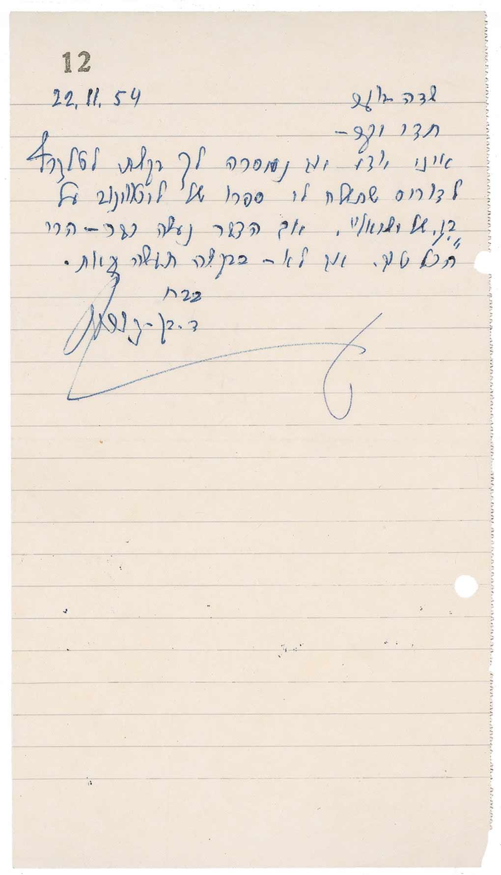 ALS in Hebrew, one page, lightly-lined, 5 x 8.5, November 22, 1954. Letter to Teddy Kolleck. In full: “I don’t know if you have got my request to tell Doris to send me Litwinov’s book entitled ‘Ben Gurion of Israel.’ If you have already done that – it’s ok, if not, please do it.” In fine condition, with punch holes to right edge, and a few light creases.