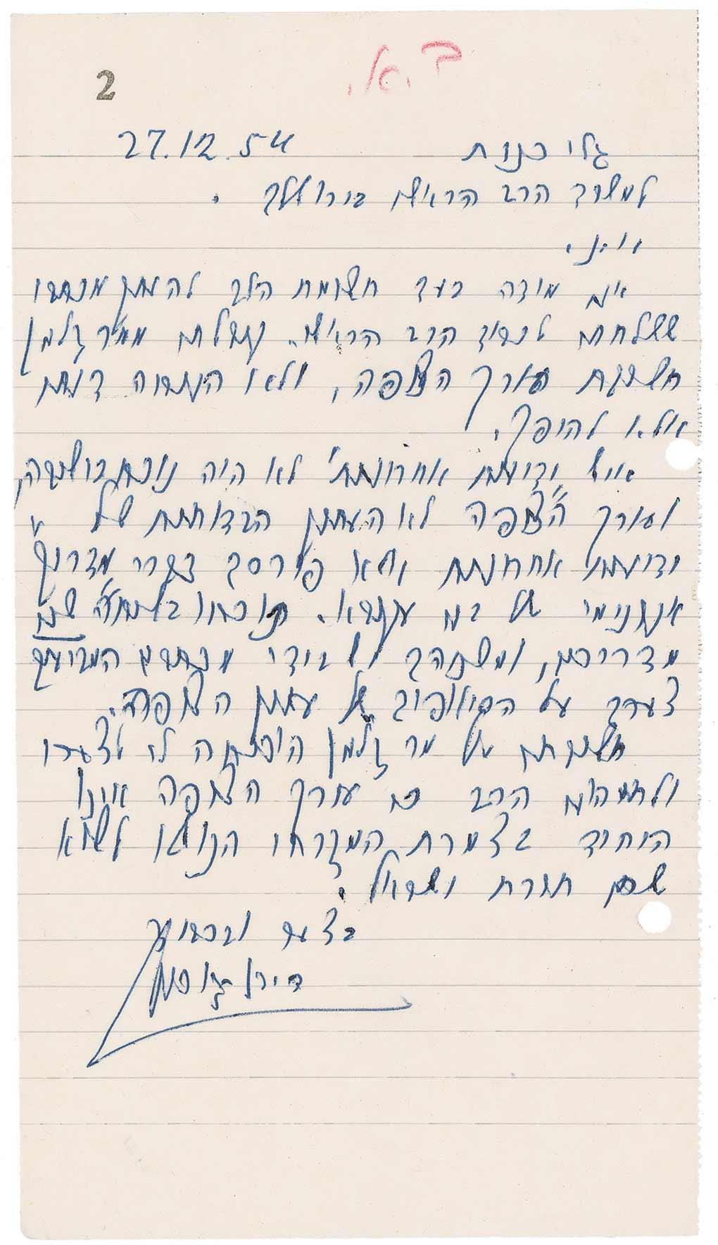 ALS in Hebrew, signed “D. Ben-Gurion,” one page, lightly-lined, 4.75 x 8.5, December 27, 1954. Letter to the office of the Chief Rabbi in Jerusalem. In part: “I thank you for your attention to the copy of my letter, which I sent to His Honor, the Chief Rabbi. I have received the response by the editor of Hatzofeh, which was sent to Mr. Zalman, and I am not satisfied with it. Rather, quite the opposite is true. No one from Yedioth Ahronoth was present at the meeting…what was published was a statement by an anonymous youth leader from the Bnei Akiva movement. Two youth leaders were present during the conversation, and I have received letters from both of them, expressing their sorrow at the distortions in the Hatzofeh newspaper.” In fine condition, with a couple light edge creases, red notation at top, and two punch holes to right edge.