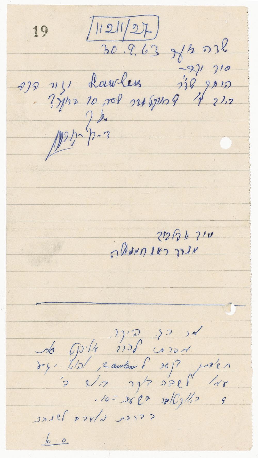 ALS in Hebrew, signed “D. Ben-Gurion,” one page, lightly-lined, 4.5 x 8.5, September 30, 1963. Short letter to Sid Appelbaum. In full: “Could Dr. Lawless come here on Friday 9 October 10 o’clock in the morning?” In fine condition, with bisecting mailing folds, punch holes to right edge, and a small stamp to top edge. Pre-certified PSA/DNA and RRAuction COA.