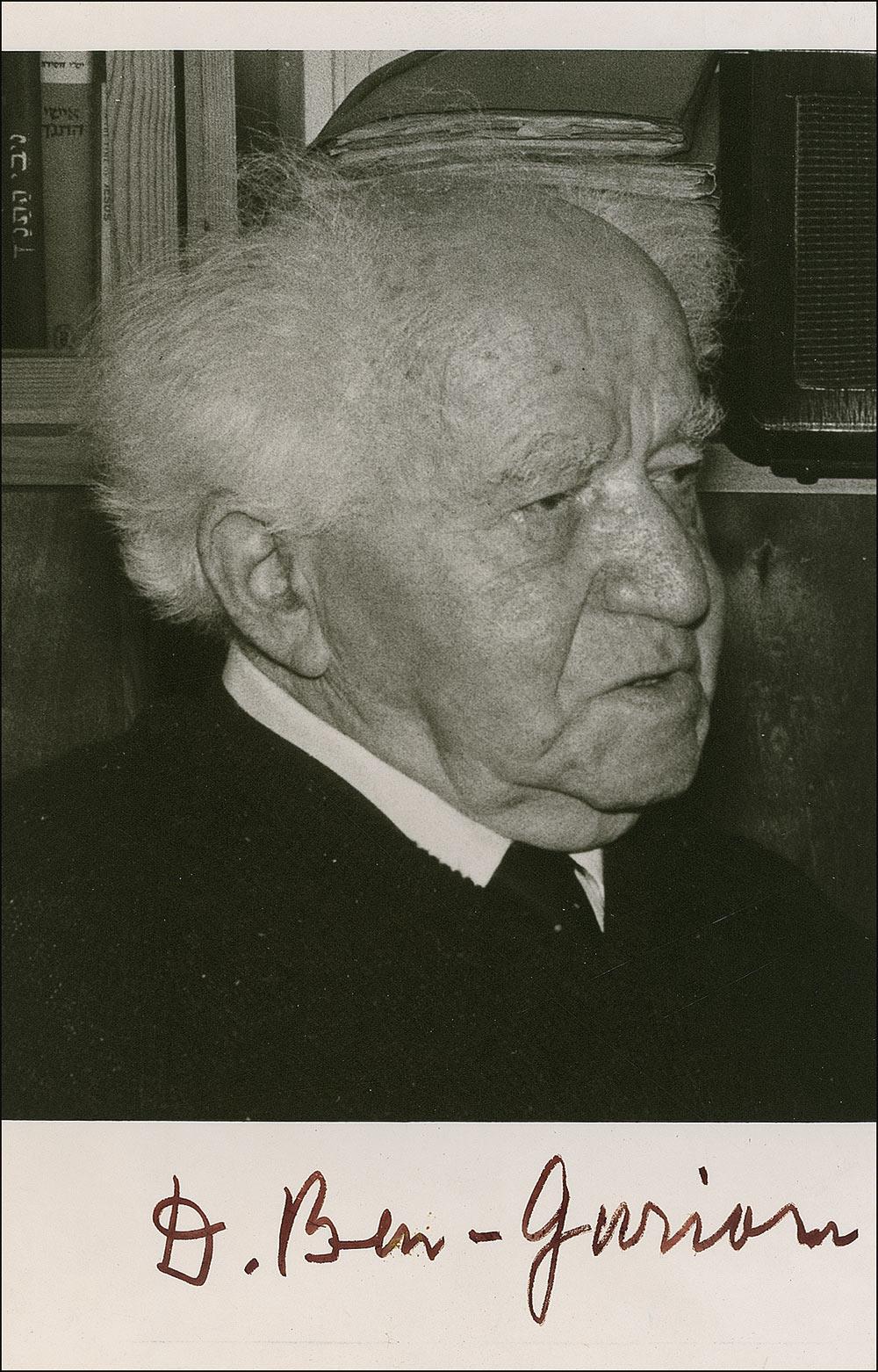 Matte-finish 3.5 x 5.5 head-and-shoulders photo, signed in the lower border in black felt tip, “D. Ben-Gurion.” In fine condition. Accompanied by a pre-printed “compliments” slip. Pre-certified PSA/DNA and RRAuction COA.