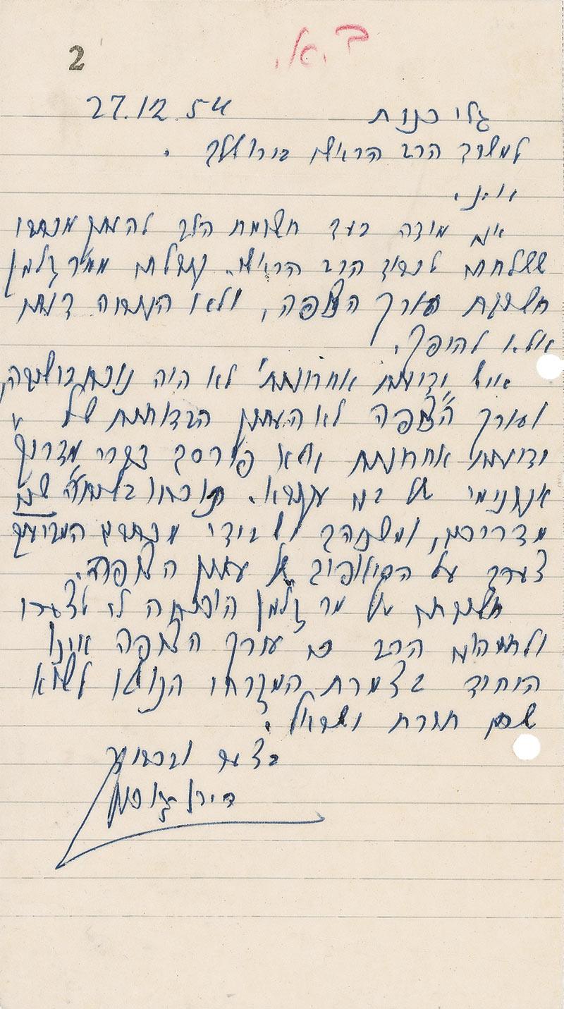 ALS in Hebrew, signed “D. Ben-Gurion,” one page, lightly-lined, 4.75 x 8.5, December 27, 1954. Letter to the office of the Chief Rabbi in Jerusalem. In part: “I thank you for your attention to the copy of my letter, which I sent to His Honor, the Chief Rabbi. I have received the response by the editor of Hatzofeh, which was sent to Mr. Zalman, and I am not satisfied with it. Rather, quite the opposite is true. No one from Yedioth Ahronoth was present at the meeting…what was published was a statement by an anonymous youth leader from the Bnei Akiva movement. Two youth leaders were present during the conversation, and I have received letters from both of them, expressing their sorrow at the distortions in the Hatzofeh newspaper.” In fine condition, with a diagonal crease to bottom, red notation at top, and two punch holes to right edge. Pre-certified PSA/DNA and RRAuction COA.