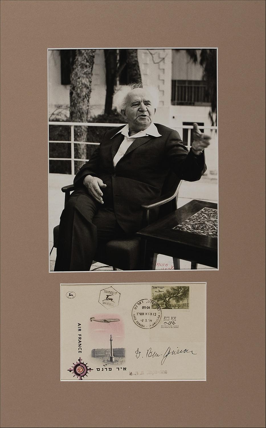 Israeli commemorative cover, 5.5 x 3.75, with a cachet honoring Air France, signed in black felt tip, “D. Ben-Gurion.” Matted with an informal photo to an overall size of 10.5 x 16.75. In fine condition.