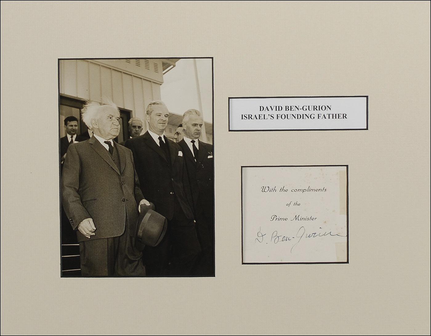 Vintage ink signature, “D. Ben-Gurion,” on an off-white 3.5 x 5.25 card pre-printed with “With the compliments of the Prime Minister.” Matted with an unsigned vintage glossy 5 x 7 photo to an overall size of 13.5 x 11. In very good condition, with tape down right side of card, some small creases, and scattered light foxing.