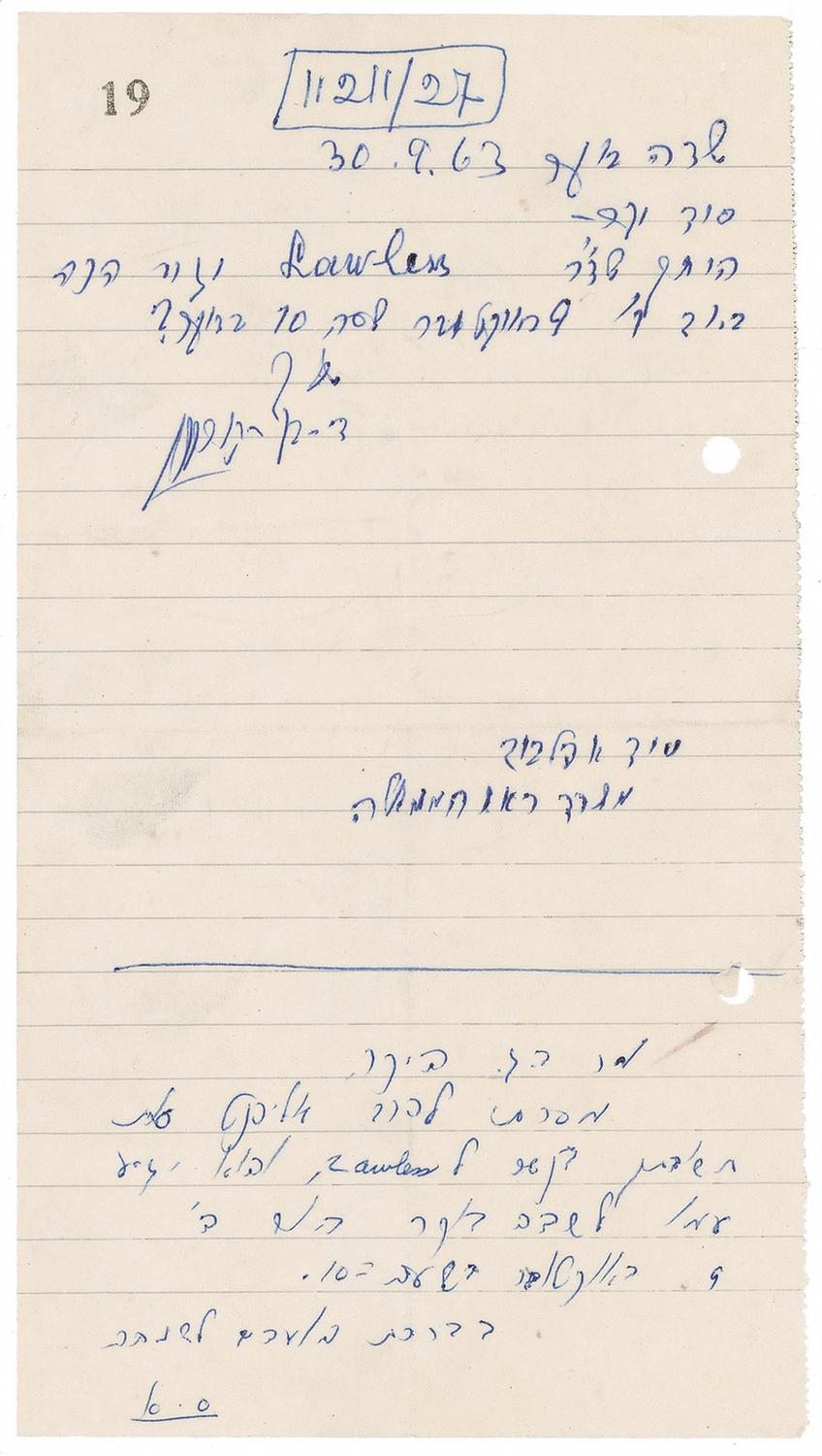 ALS in Hebrew, signed “D. Ben-Gurion,” one page, lightly-lined, 4.5 x 8.5, September 30, 1963. Short letter to Sid Appelbaum. In full: “Could Dr. Lawless come here on Friday 9 October 10 o’clock in the morning?” In fine condition, with central horizontal and vertical mailing folds, punch holes to right edge, and a small stamp to top edge.