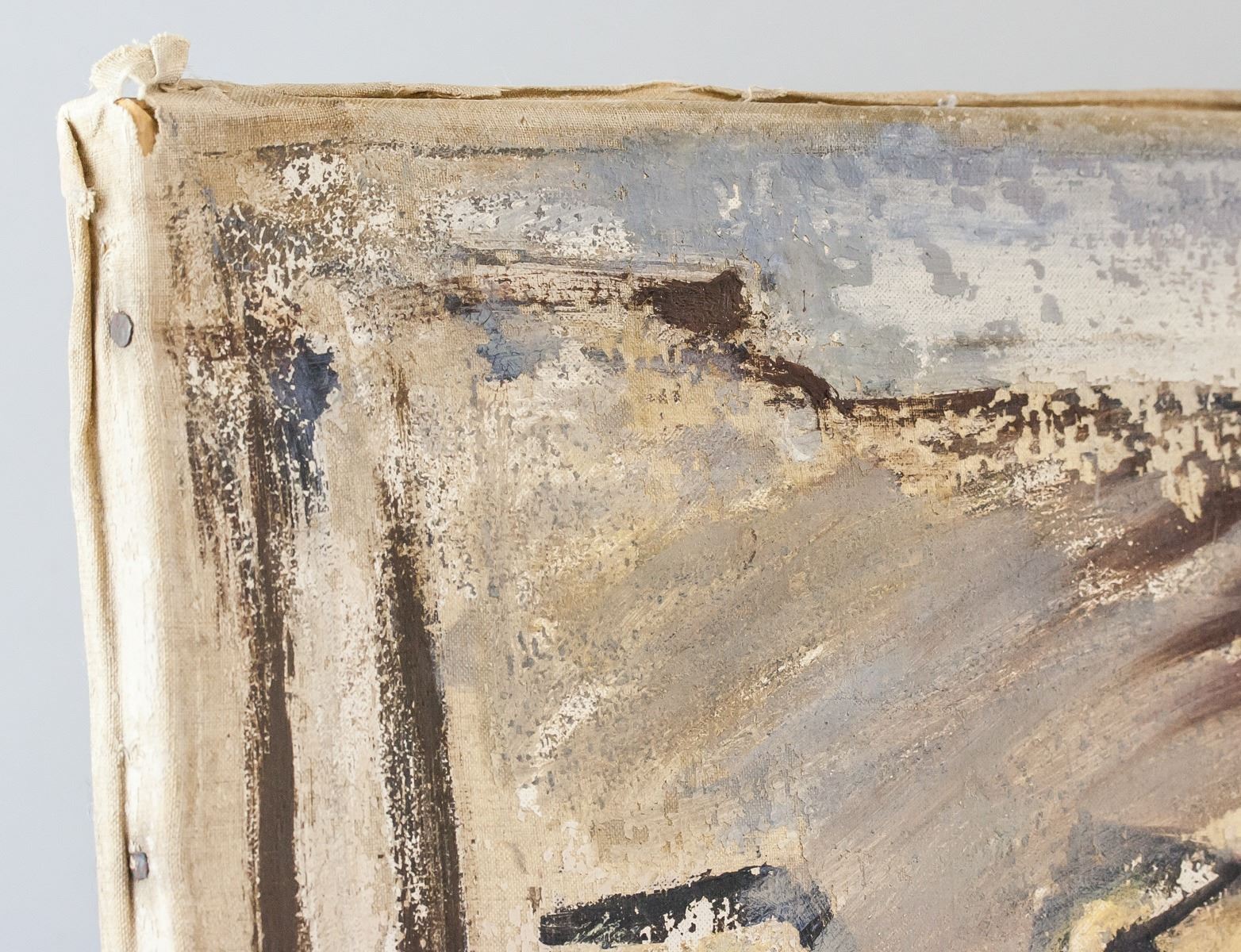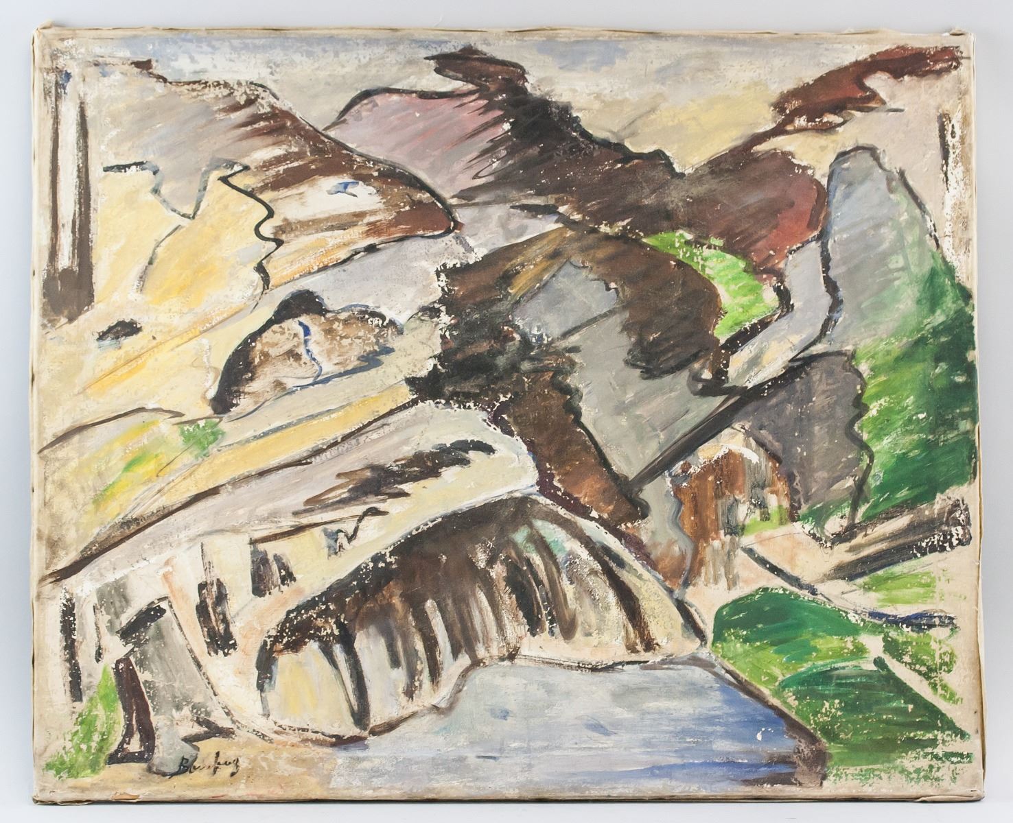 Oil on canvas. Featuring an abstract expressionist landscape scene. Signed Bomberg on the lower left corner. Stamped FRANKONIA MALLEINEN on verso. Attributed to David Bomberg (1890-1957, British). 66 x 81 cm (26 x 31.5 inches). Provenance: This lot carries limited provenance from a Greek estate