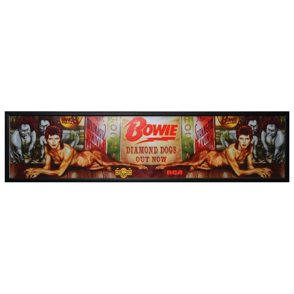 Uncommon original color 33.75 x 8.5 RCA Records promotional poster banner for David Bowie’s 1974 album Diamond Dogs, which featured mirrored images of the album artwork designed by Guy Peellaert, showing Bowie as a grotesque man-dog hybrid, with prominent central text: “Bowie, Diamond Dogs, Out Now.” Mounted, framed, and in fine condition.