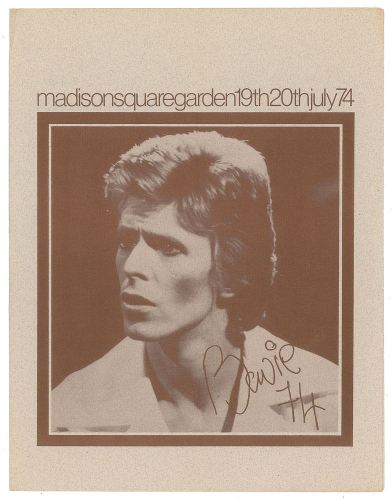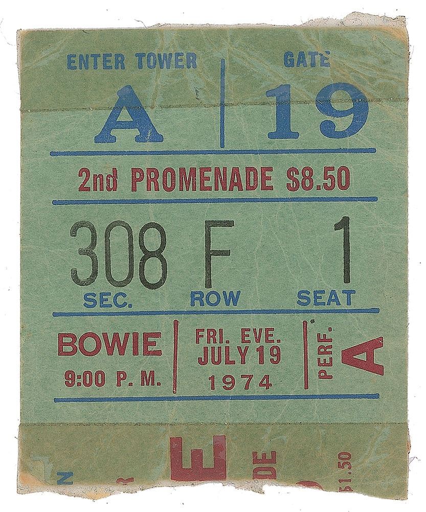 Original program for David Bowie’s two-night concert showcase at Madison Square Garden in New York City on July 19 and 20, 1974, as part of the Diamond Dogs Tour, 8.5 x 11, two pages, with interior featuring band and production credits. Included with the program is an original ticket stub for the first night of the concert series, 1.7 x 2, issued as “Tower A, Gate 19, Sec. 308, Row F, Seat 1,” with red text reading: “2nd Promenade $8.50, Bowie 9:00 P. M., Fri. Eve July 19, 1974, Perf. A.” In overall very good to fine condition, with intersecting folds to the program, and old tape to the edges of the ticket stub.