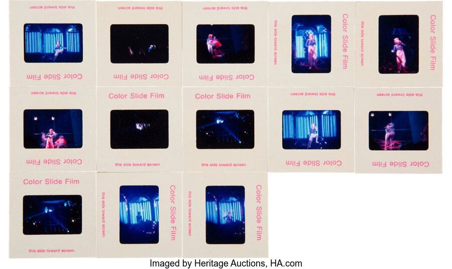 David BowieColor Slides (13) In Box. A total of 13 color slides of the British music legend in a multi-colored boxed labeled "Color Slides" on one side. In Very Good Plus condition with light handling wear.