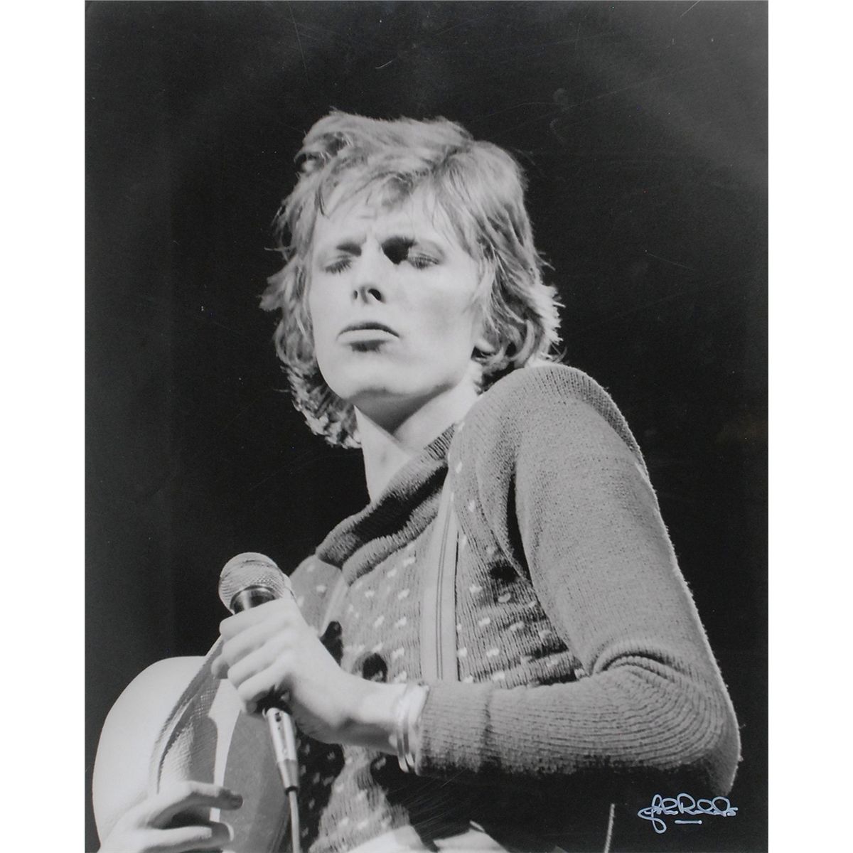 Oversized satin-finish 16 x 20 photo of Bowie on stage during his Diamond Dogs tour, circa 1974, signed in white ink by photographer John Rowlands. In fine condition.