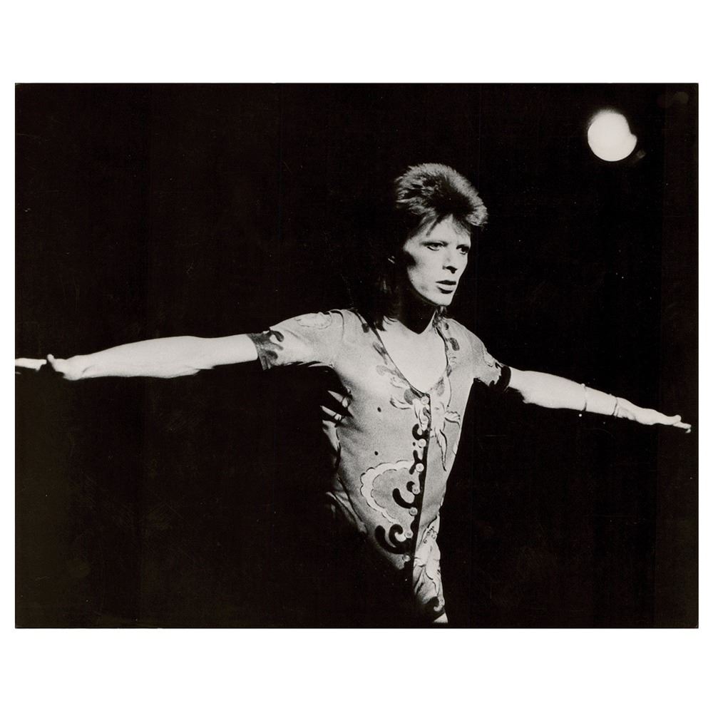 Original glossy 10 x 8 silver gelatin photograph of David Bowie at Leeds in 1973 during the Ziggy Stardust Tour. Reverse bears a Kevin Cummins credit stamp. In fine condition.
