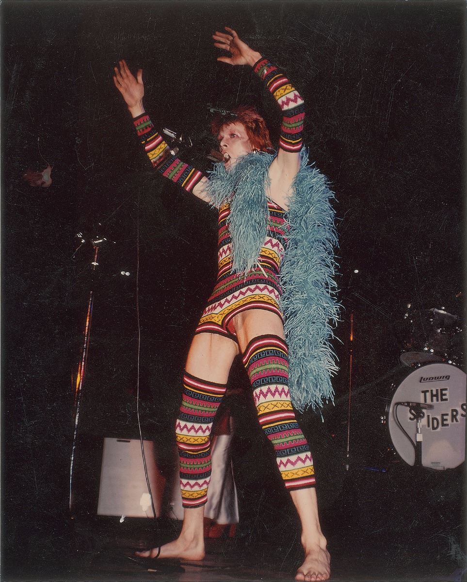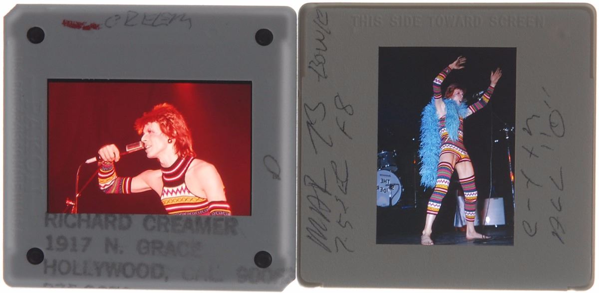 Two slides and a photo by Richard Creamer: two color 35mm slides showing David Bowie performing in outrageous costumes, and an original glossy 8 x 10 enlargement of one of the slides. In overall fine condition. Provenance: Richard Creamer Estate.