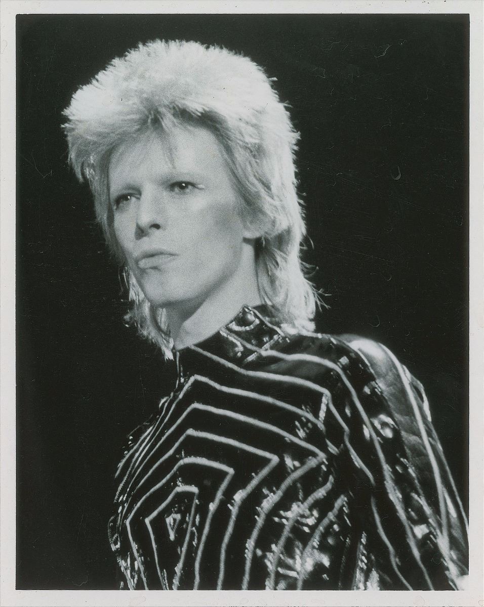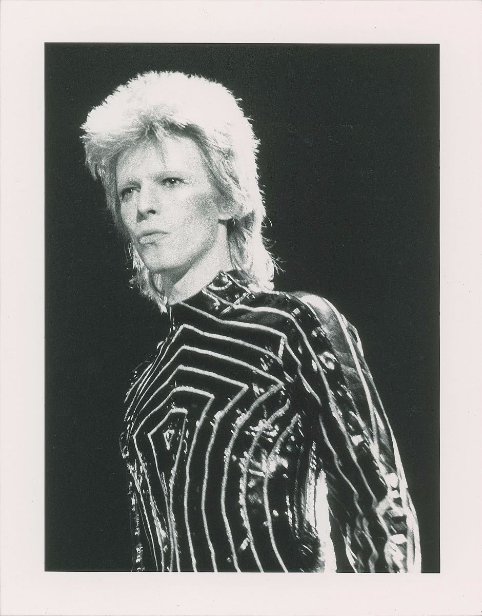 Fantastic original satin-finish 11 x 14 photo of Bowie on stage in one of his dazzling outfits by Richard Creamer, with a matching 8 x 10 positive transparency. In fine condition. Provenance: Richard Creamer Estate.