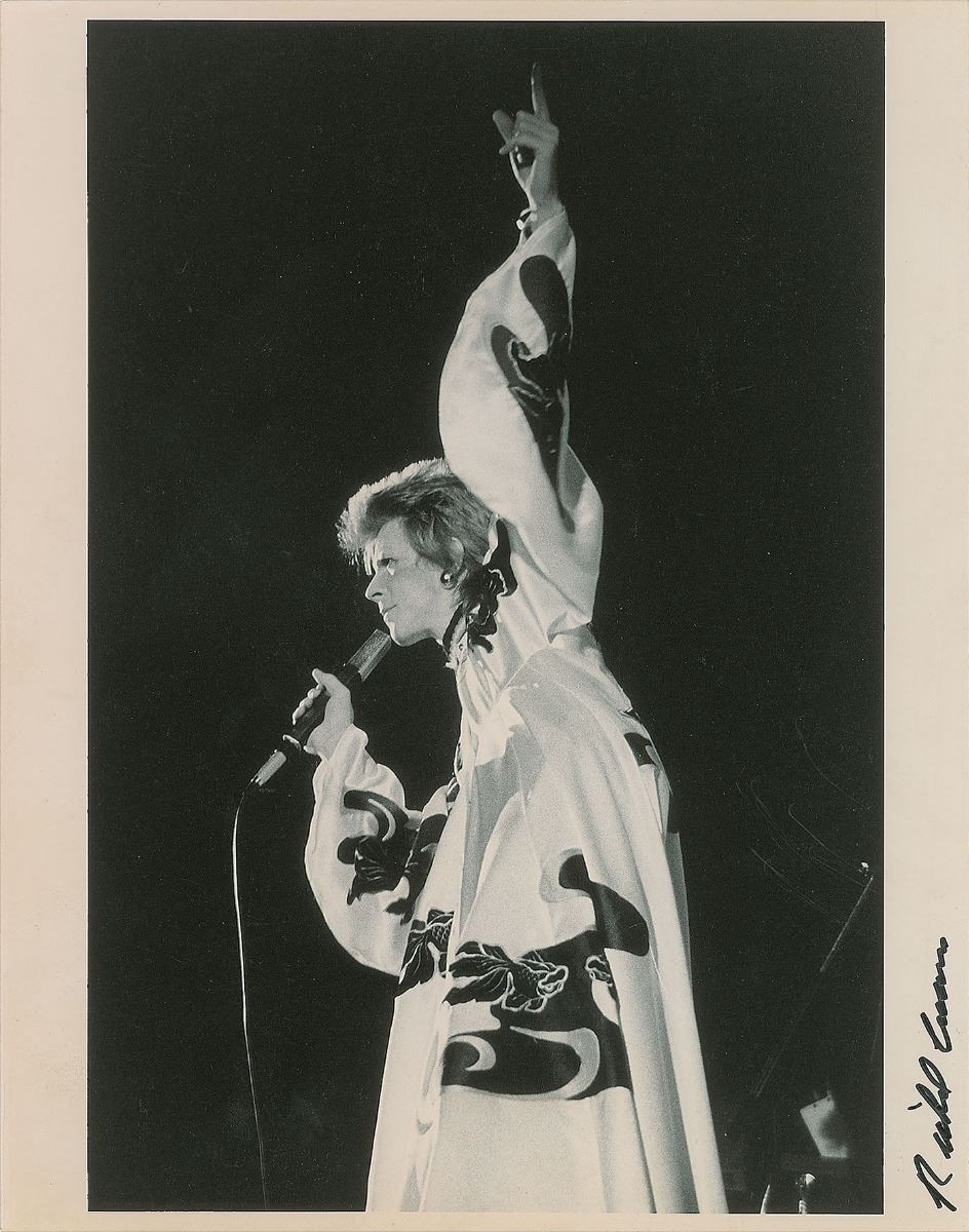 Original satin-finish 11 x 14 photo of Bowie mid-performance by Richard Creamer, signed in the border in black felt tip by Creamer. In fine condition. Provenance: Richard Creamer Estate.