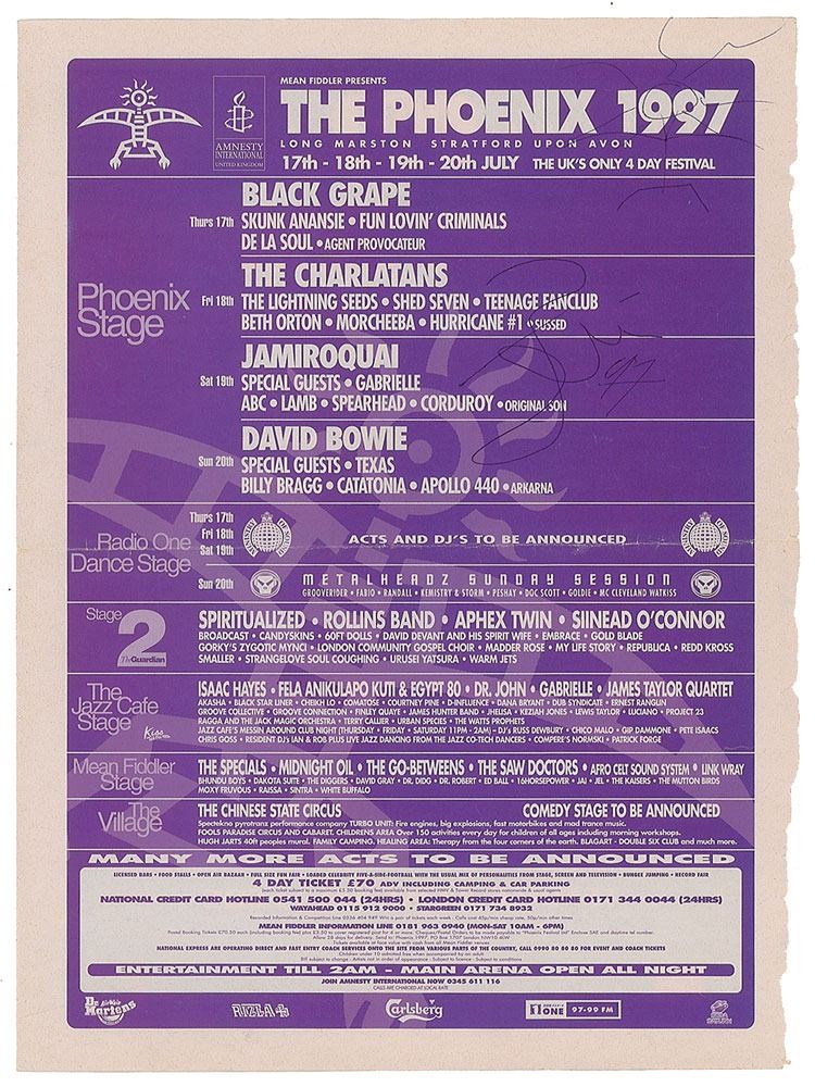 Magazine advertisement for the 1997 Phoenix Festival held at the Long Marston Airfield near Stratford-Upon-Avon from July 17 to 20, 1997, 8.75 x 11.75, signed in black ballpoint, "Bowie, 97," who adds a figure sketch above. In fine condition, with poor-to-moderate signature contrast and a central horizontal fold. Bowie headlined the main stage on the fourth and final night of the Phoenix Festival, with Black Grape, The Charlatans, and Jamiroquai headlining the other three nights. Accompanied by a photo of Bowie during his Phoenix performance and by a letter of provenance from the original recipient.