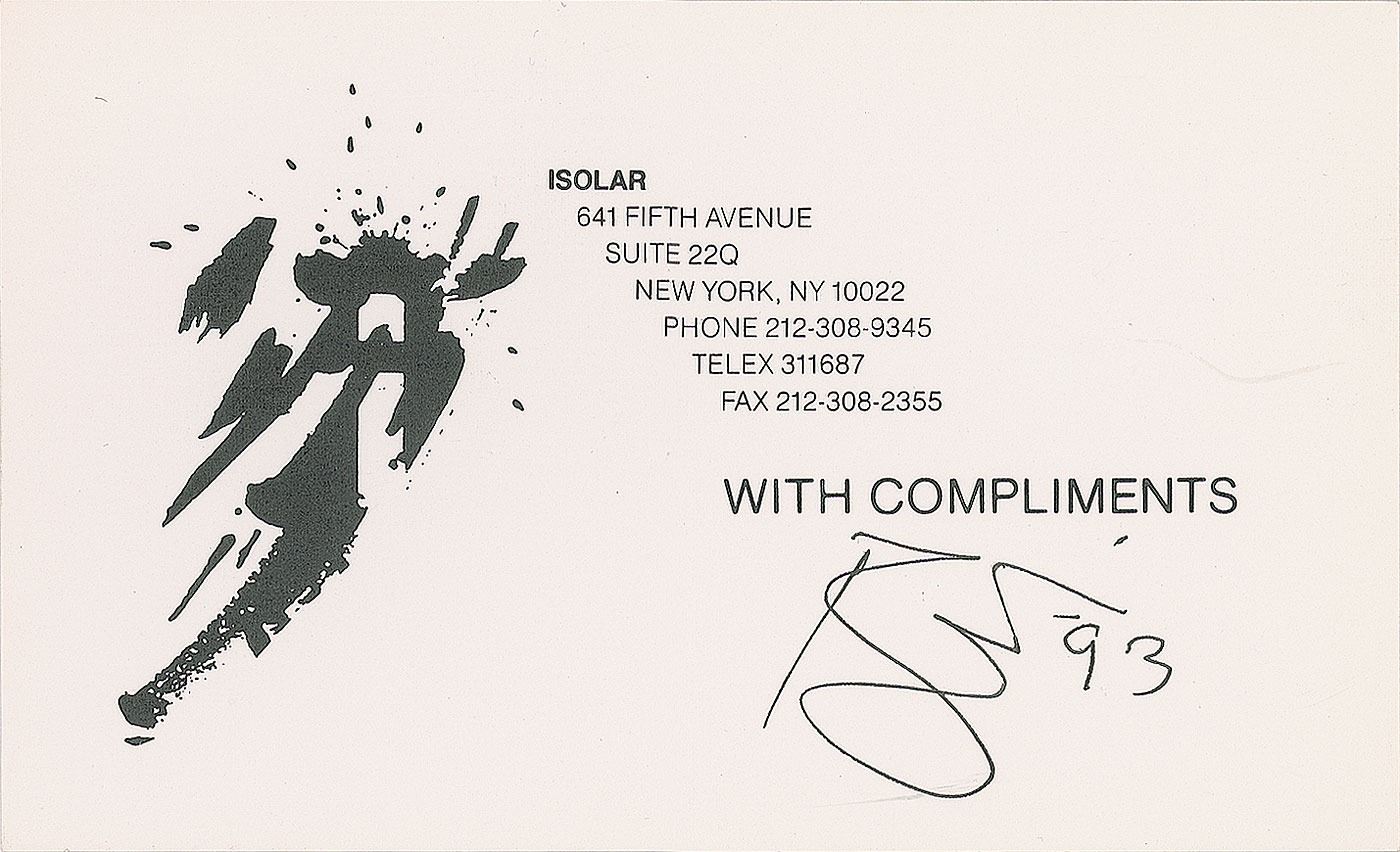 Ballpoint signature of David Bowie, who adds the year, "93," on a white 5.25 x 3.25 Isolar compliments card. In fine condition. Bowie signed a number of these cards for a BMG Music senior executive in 1993, and they were sent out with copies of his Black Tie White Noise album. This example comes from a portion of the cards that were retained by the executive.
