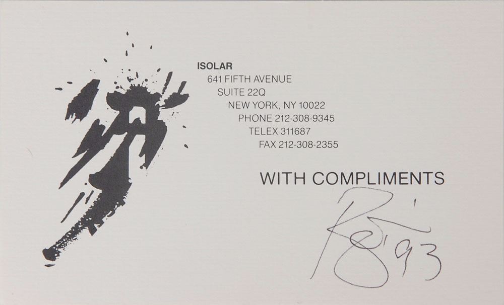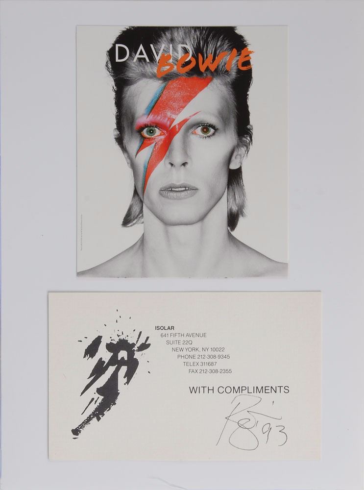 Ballpoint signature of David Bowie, who adds the year, "93," on a white 5.25 x 3.25 Isolar compliments card partially affixed to a white 7 x 9.5 sheet bearing an affixed image from Aladdin Insane. In very fine condition. Isolar was Bowie's production company. Pre-certified REAL.