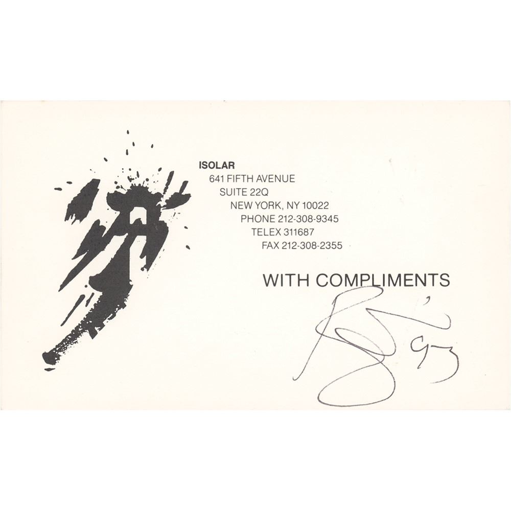 Ballpoint signature of David Bowie, who adds the year, "93," on a white 5.25 x 3.25 Isolar "With Compliments" card. In very fine condition. Isolar was David's production company. Accompanied by a full letter of authenticity from PSA/DNA.