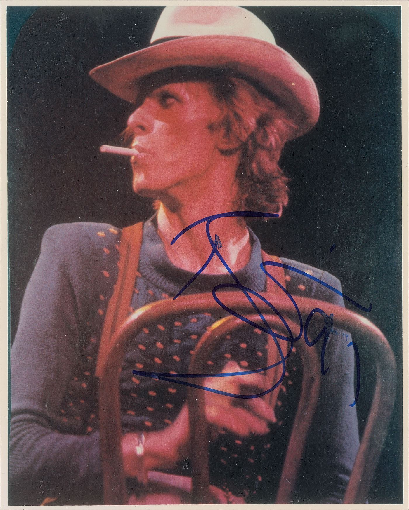 Color glossy 8 x 10 half-length photo of Bowie seated in a backwards chair and smoking a cigarette, signed in blue felt tip, "Bowie, 91." In fine condition. Originally obtained by in-person specialist Mike Wehrmann.