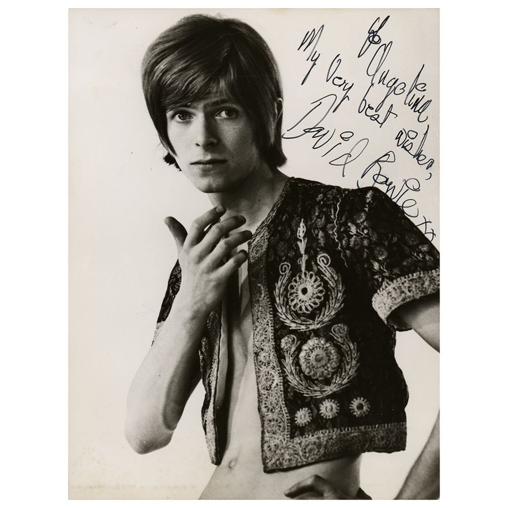 Super early glossy 7.25 x 9.5 photo of David Bowie from circa 1967, signed and inscribed in black felt tip, "To Angelina, My very best wishes, David Bowie, xx.†Reverse bears a German publication stamp. In fine condition, with a few small creases. Autographed at the start of his formidable career, this Bowie photograph is highlighted by the rare union of an uncommon early pose and a large, full signature.