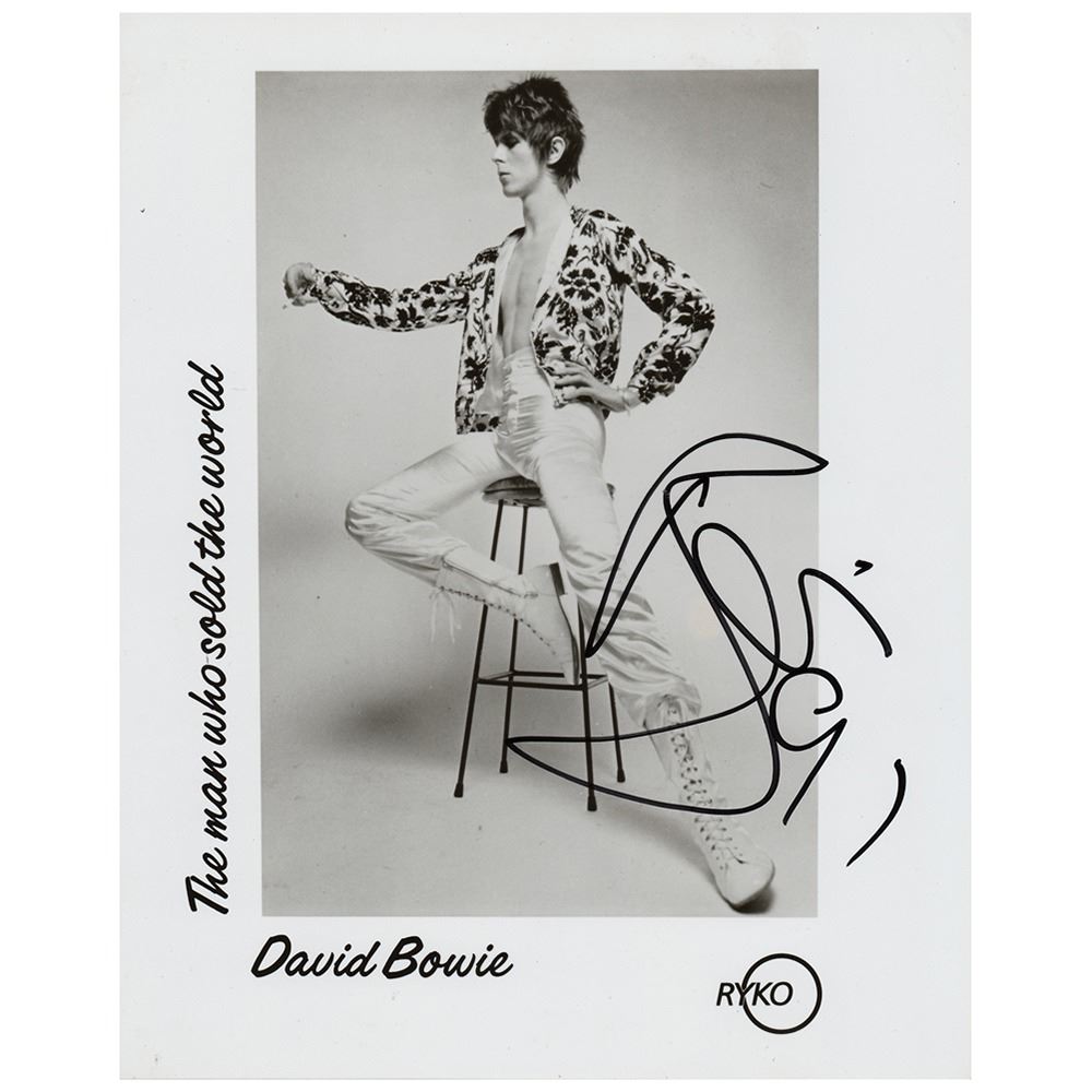 Glossy 8 x 10 Ryko publicity photo of David Bowie for the release of his third studio album, The Man Who Sold the World, signed in black felt tip, "Bowie, 91." In fine condition, with scattered light creasing.