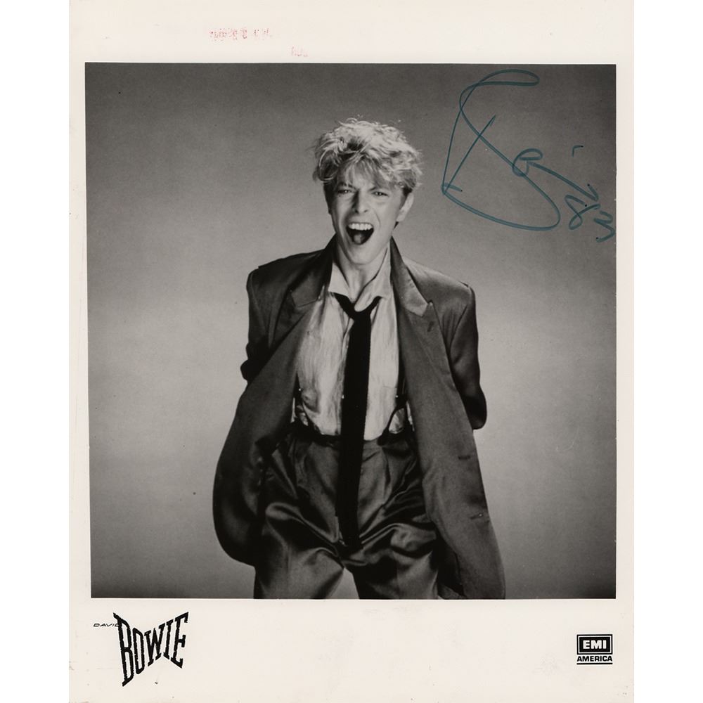 Fantastic glossy 8 x 10 EMI America publicity photo of David Bowie, signed in black felt tip, "Bowie '83." In fine condition. Accompanied by a letter of authenticity from Bowie expert Andy Peters.