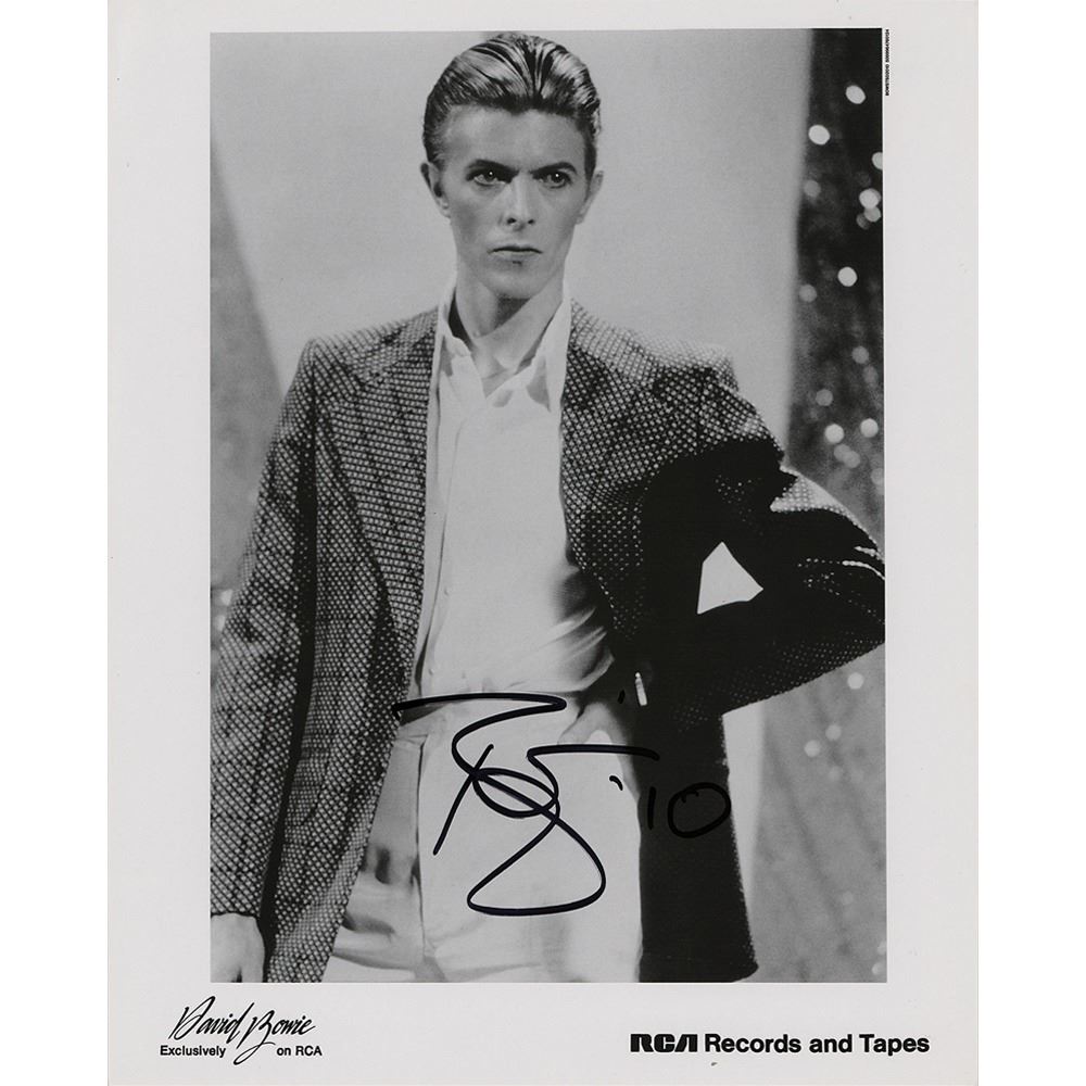 Fantastic 8 x 10 RCA Records cardstock promo photo of David Bowie in a great half-length pose, signed in bold black felt tip, "Bowie, '10." In fine condition, with some small edge creases. Accompanied by a letter of authenticity from Bowie expert Andy Peters.