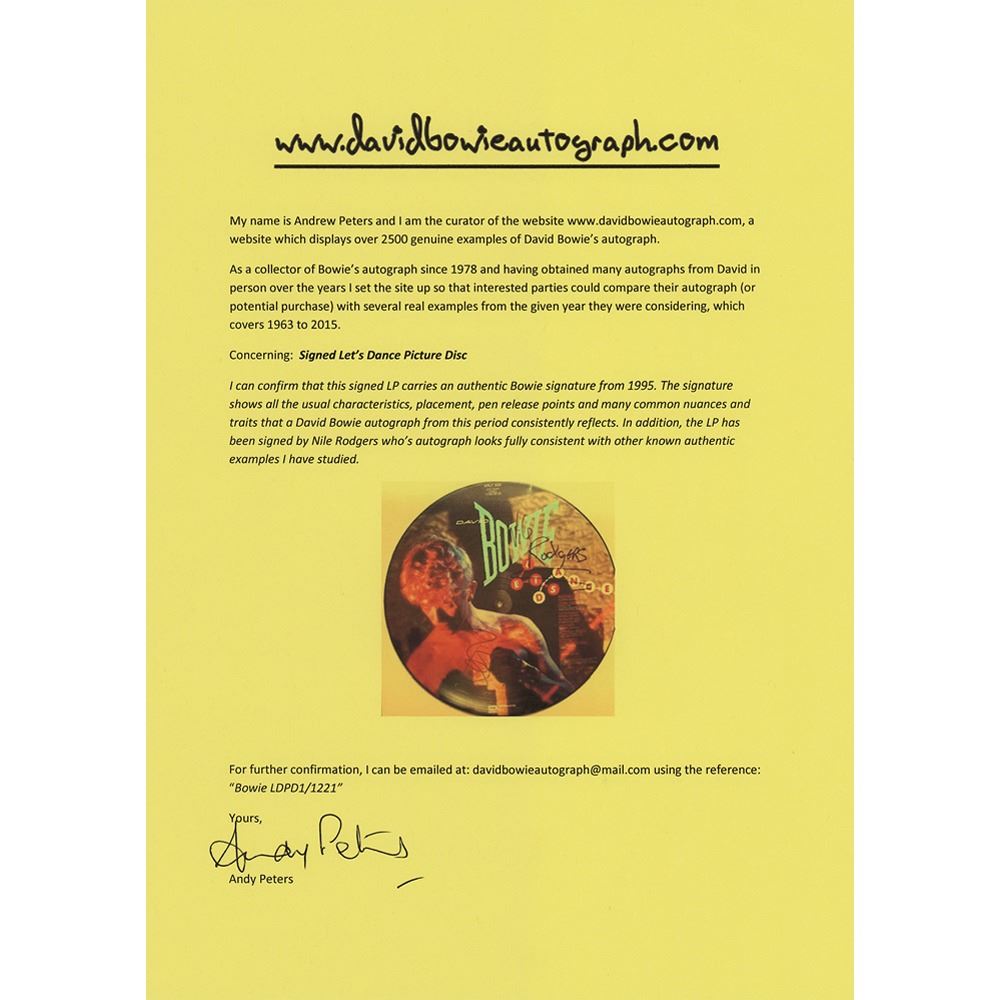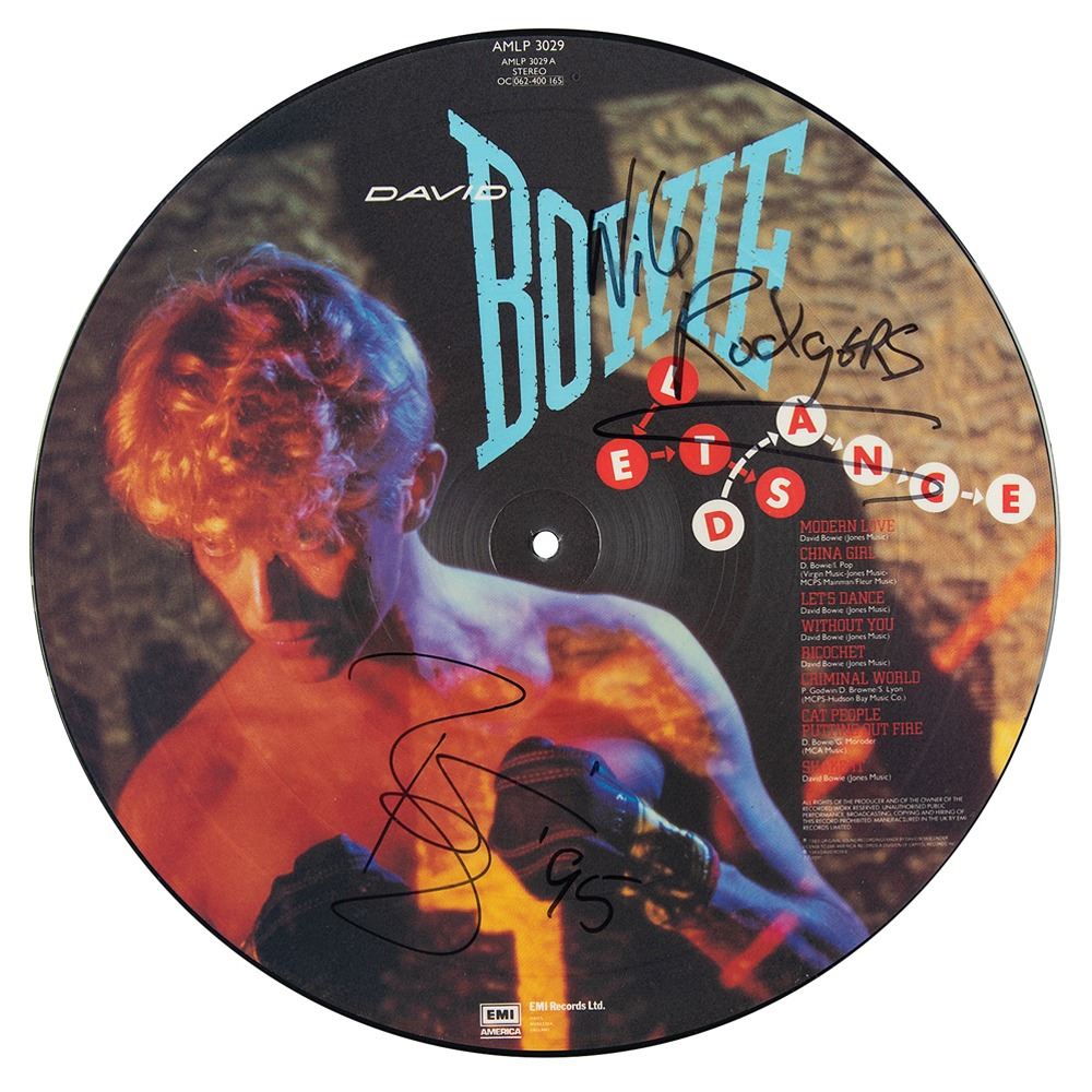 Let's Dance picture disc signed in black felt tip by David Bowie, "Bowie '95." Also signed by the album's legendary producer, "Nile Rodgers." In fine condition. The record is included. Accompanied by a letter of authenticity from Bowie expert Andy Peters. Released to massive commercial success in 1983, Let's Dance remains Bowie's best-selling album.