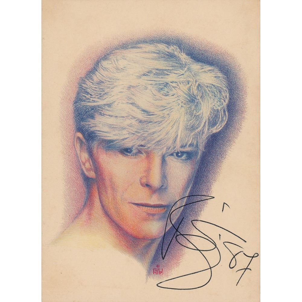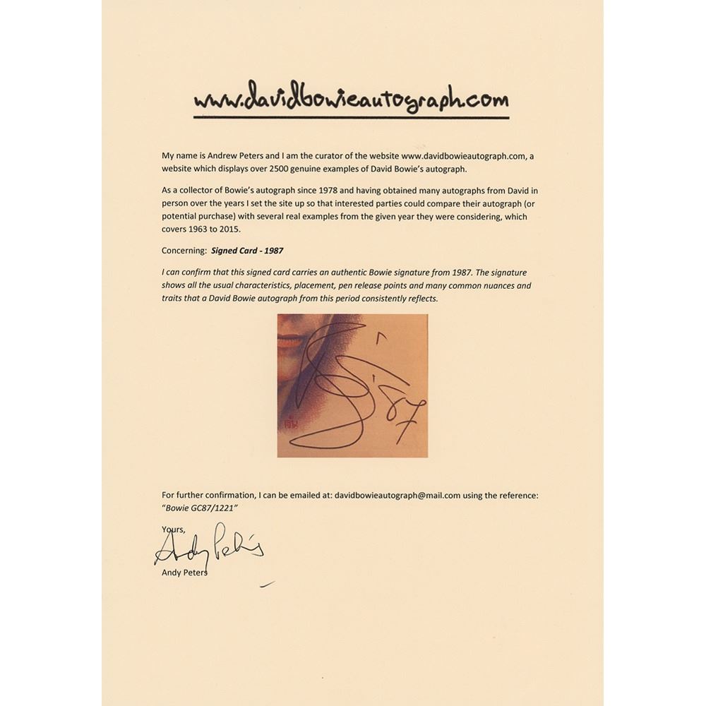 Desirable color 4 x 5.75 EMI Records promo card featuring an artist's portrait of David Bowie, signed in black ballpoint, "Bowie, '87." In very fine condition. Accompanied by a letter of authenticity from Bowie expert Andy Peters.